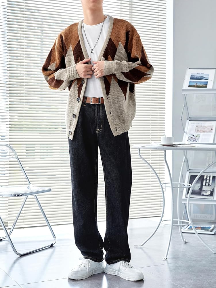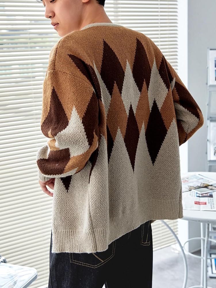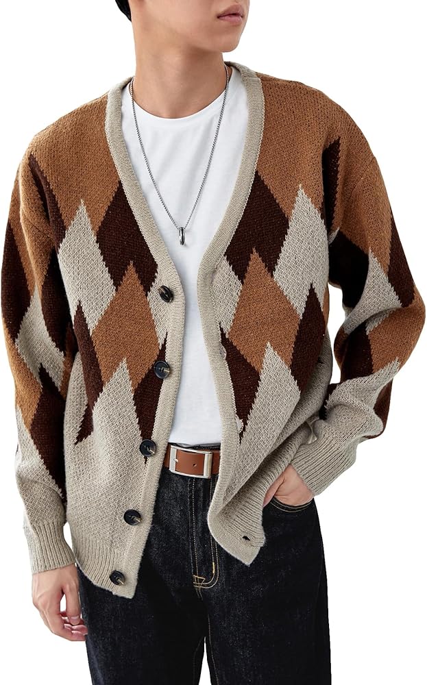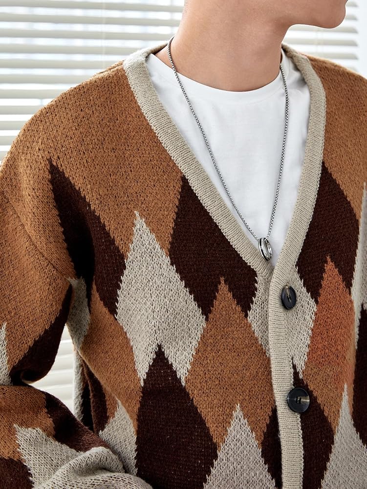 - المزايا: نمط أرجايل، رقبة على شكل حرف V، أزرار سفلية، كتف منسدل، سترة صوفية للرجال