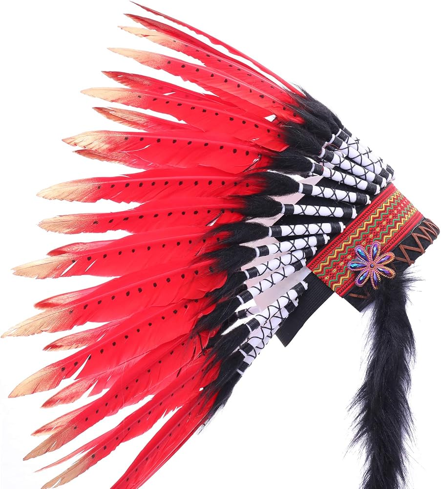 - غطاء الرأس الريش الموضح صغير الحجم للبالغين. الحجم التقريبي - عرض 24-26 بوصة وارتفاع 14-19 بوصة مع قلادة من الريش المنفوش.