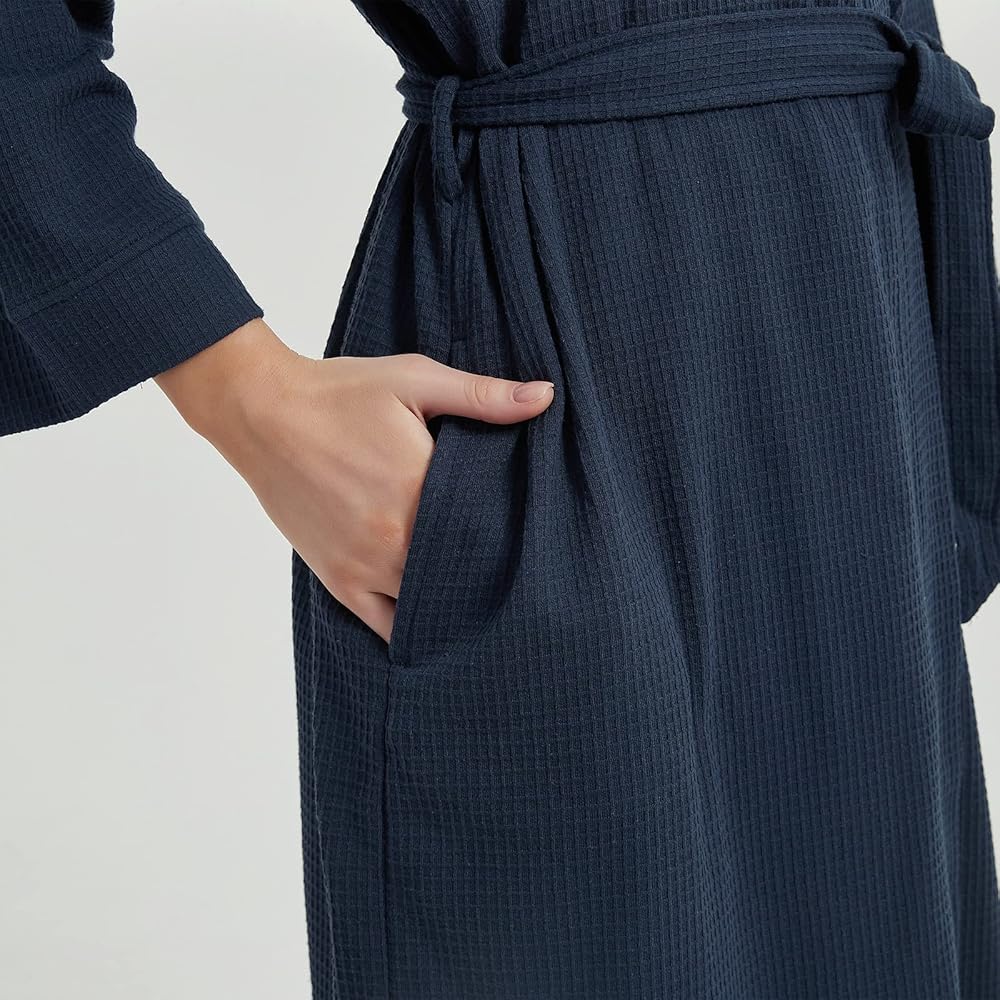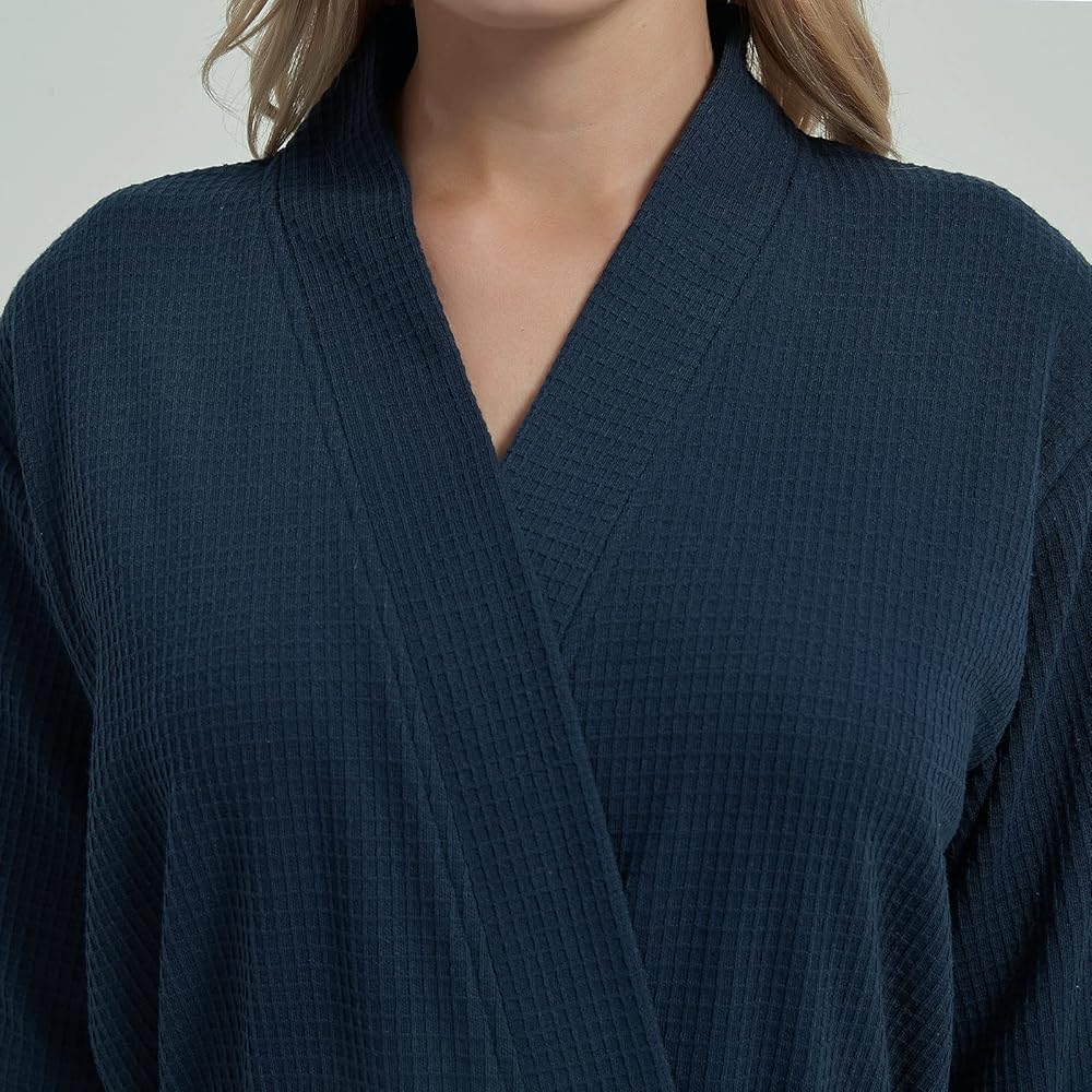 ناعم ومسامي: رداء وافل خفيف الوزن، مصنوع من 60% قطن و40% بوليستر، مما يخلق لمسة ناعمة ولطيفة على بشرة المرأة الحساسة. يعمل بشكل جيد في امتصاص الرطوبة، مما يجعلك في حالة جافة ونظيفة. رداء حمام كلاسيكي من نسيج الجاكار مع خط عنق أنيق على طراز الكيمونو وجيوب وحزام قابل للإزالة، مريح في الارتداء. لا يوجد خطر من ارتفاع درجة الحرارة، مناسب للربيع والصيف والخريف.