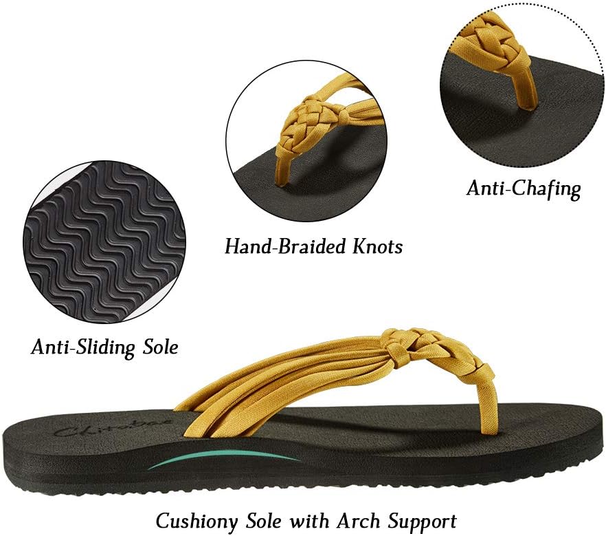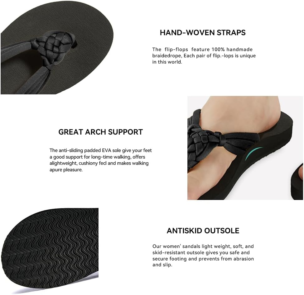 • صنادل ثونغ مع ضفائر فريدة من نوعها ¡§C ونعل EVA المبطن المضاد للانزلاق مع دعم القوس يمنح قدميك دعمًا جيدًا للمشي لفترة طويلة ويمنع قدميك من التعرق خلال أيام الصيف الحارة.