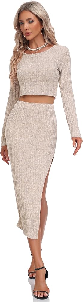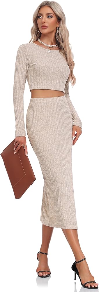 [مجموعة تنورة مكونة من قطعتين] مجموعة فساتين محبوكة بأكمام طويلة، ملابس سترة خريفية كاجوال، قميص قصير برقبة مستديرة رفيعة مع تنورة مضلعة لطيفة، أنيقة وعصرية.
