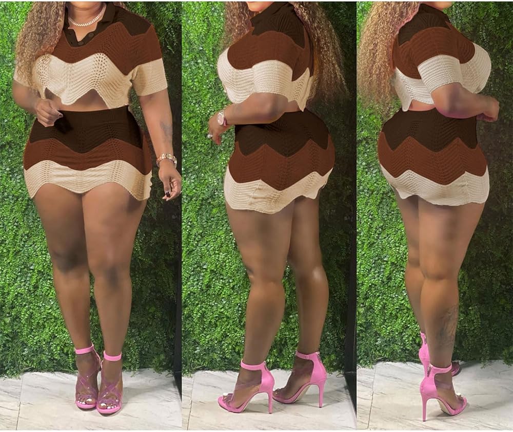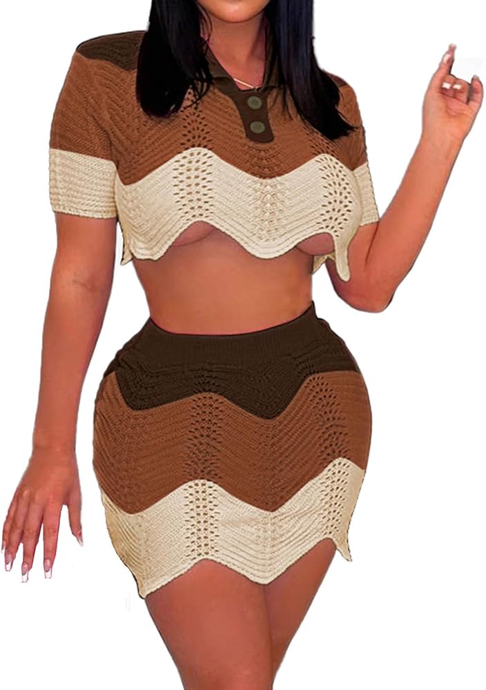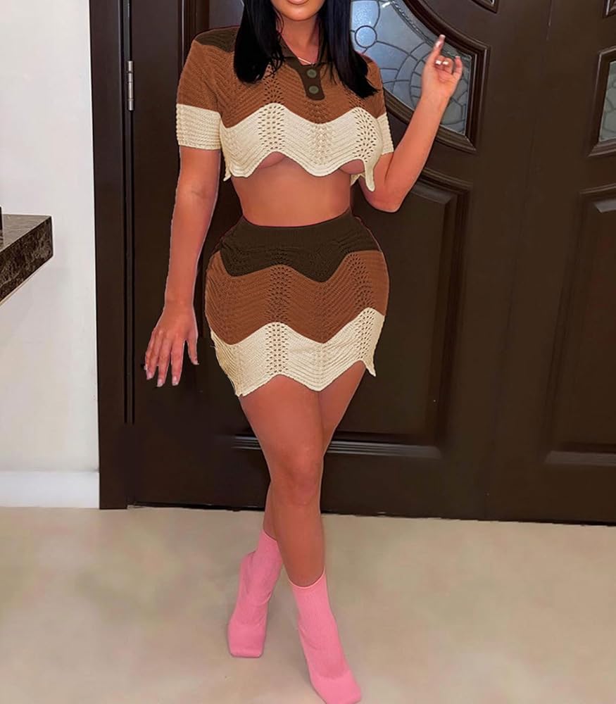 السمات: طقم تنورة نسائي من قطعتين بتصميم مكعبات الألوان، تي شيرت بولو قصير الأكمام وتنورات ضيقة عالية الخصر، تصميم حاشية مموجة، بلوفر علوي بياقة مقلوبة وأزرار، مقاس نحيف، ملابس صيفية من قطعتين للسيدات.
