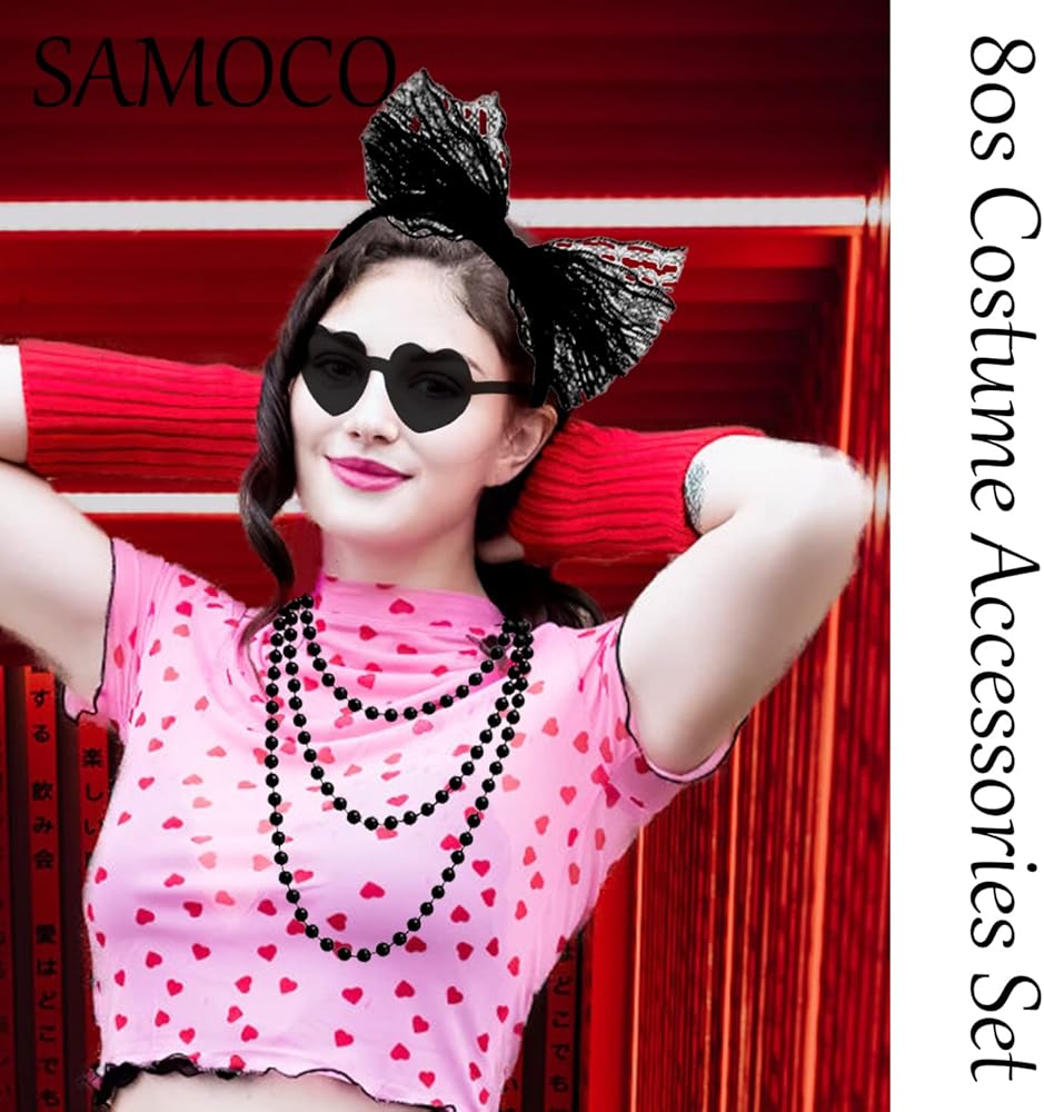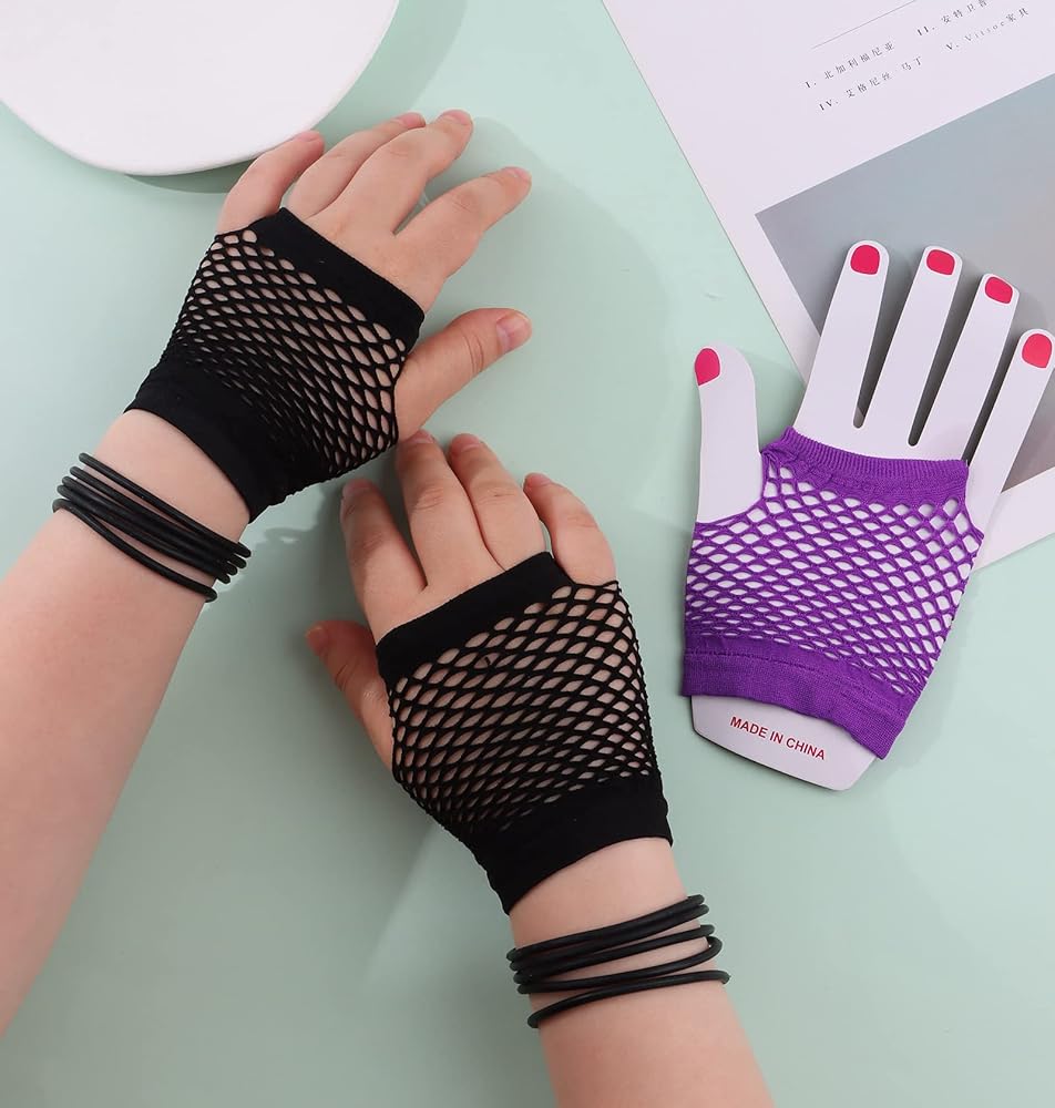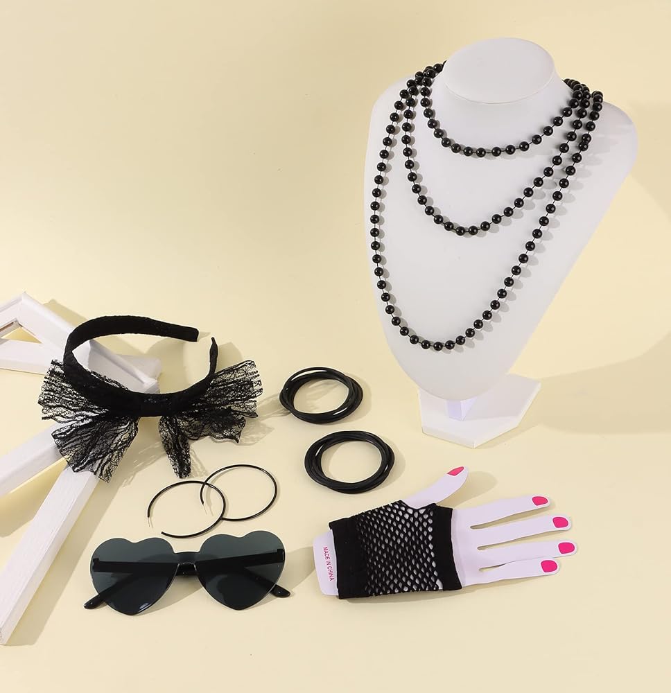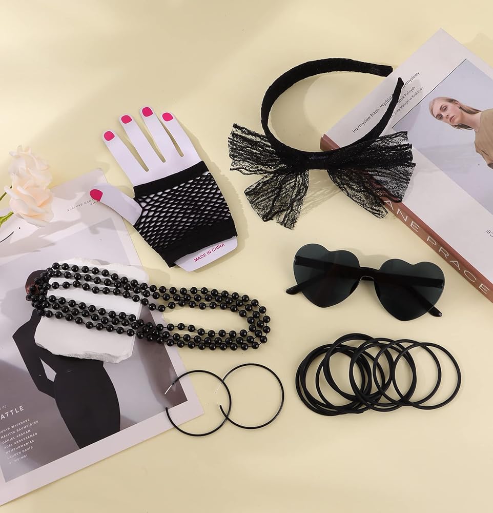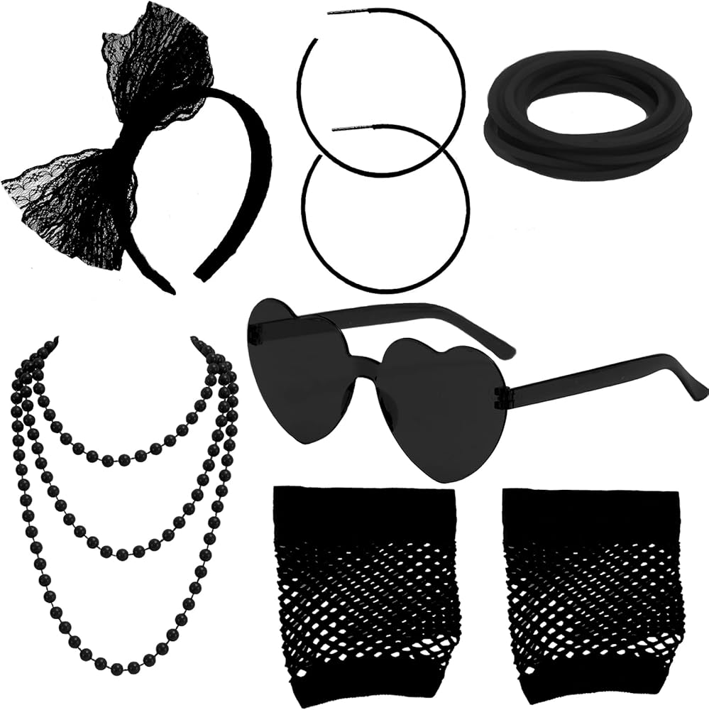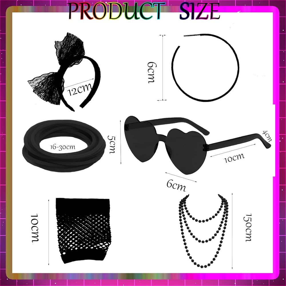 80s Costume Accessories Set:Packaging included 1 pc lace butterfly headband,1 pair vintage neon hoop earrings ,1 pair fingerless fishnet gloves, 1pc jelly colored frameless heart shaped one-piece sunglasses 1 piece necklace and 10 pieces silicone bracelets; Great meet you demands for 80's party costume and Hallow.There are four colors for you to choose from: rose red, black, green, and purple.