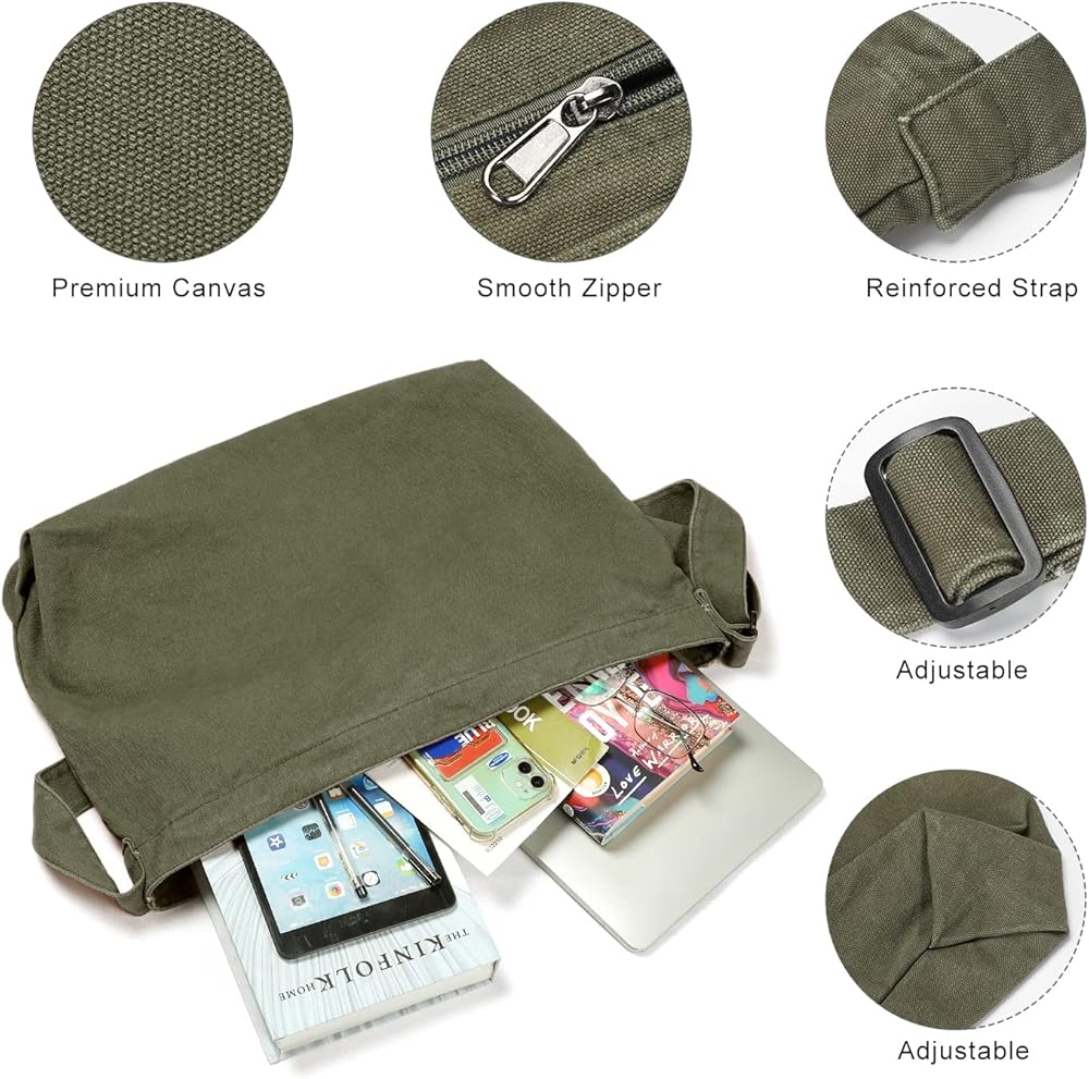 ✅الهيكل الوظيفي: تحتوي حقيبة المراسلين القماشية للجنسين على مساحة رئيسية واحدة، وجيب داخلي بسحاب، وجيب داخلي مفتوح. إغلاق السحاب العلوي للمحفظة سيحافظ على مقتنياتك آمنة.