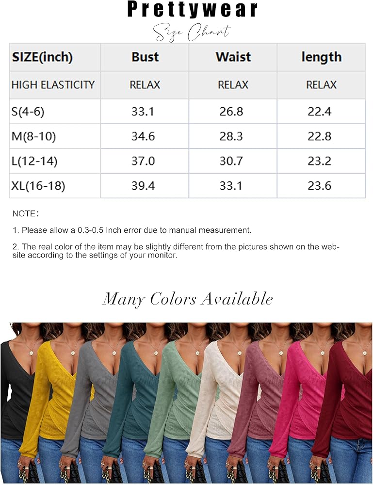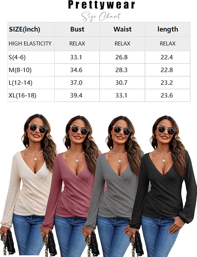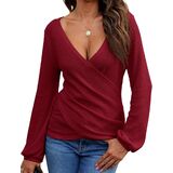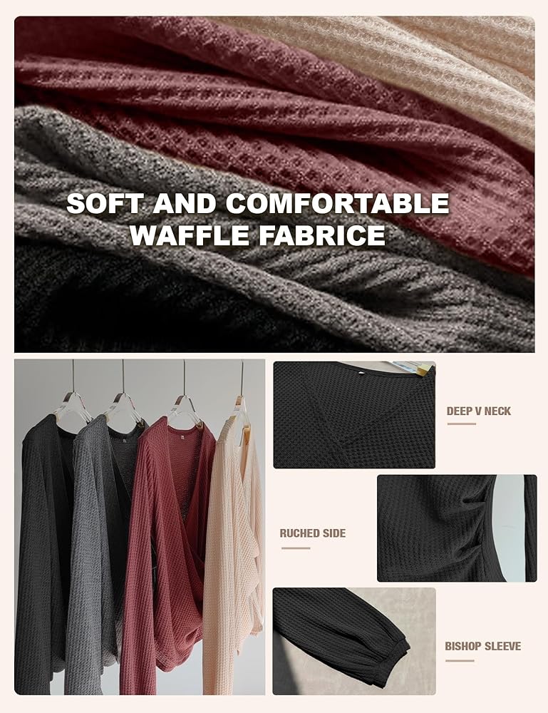 【تصميم عصري】رقبة عميقة على شكل حرف V، لفافة أمامية، جانب مكشكش، لون ثابت، أكمام طويلة، أكمام أسقف، مقاس نحيف، قمصان علوية من نسيج وافل ناعم، قمصان كاجوال للسيدات، طراز كاجوال لجميع المواسم.