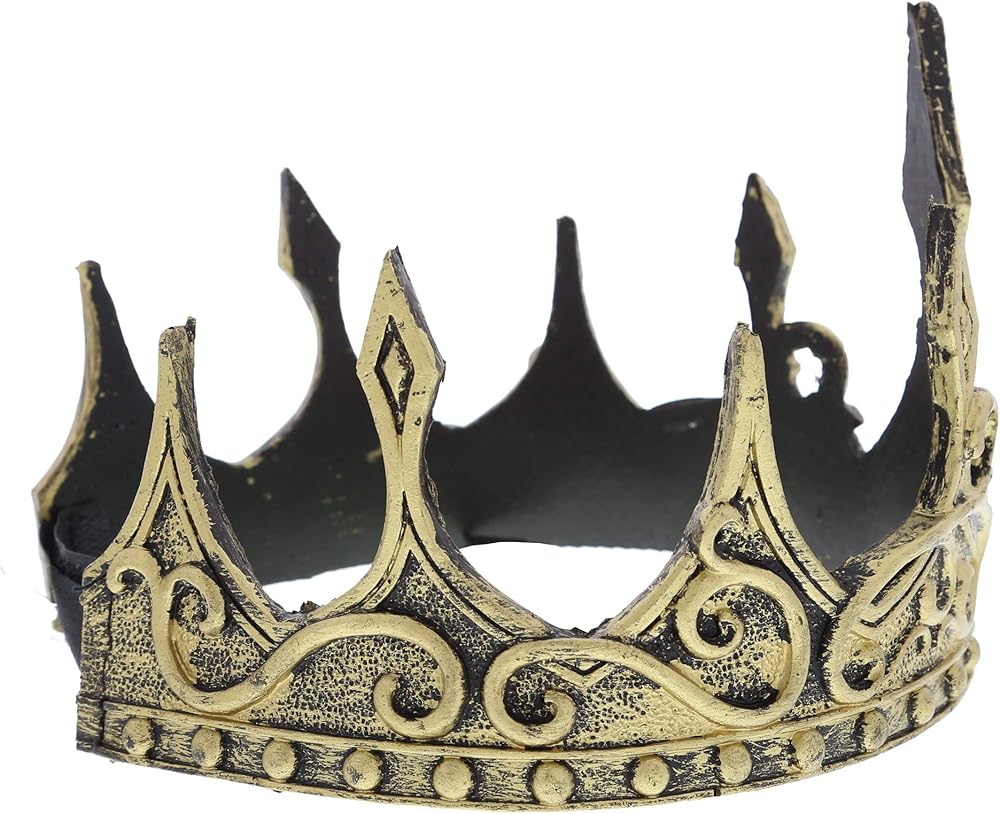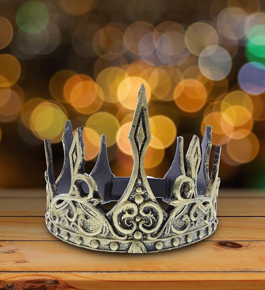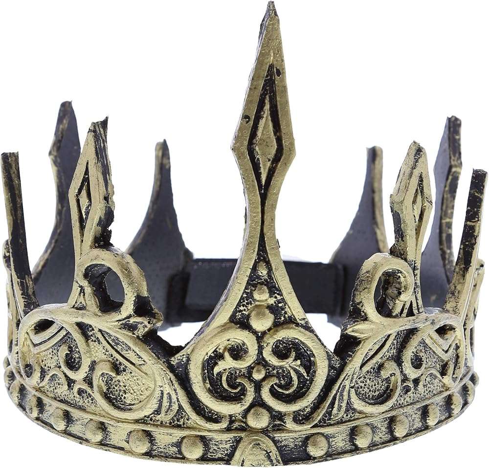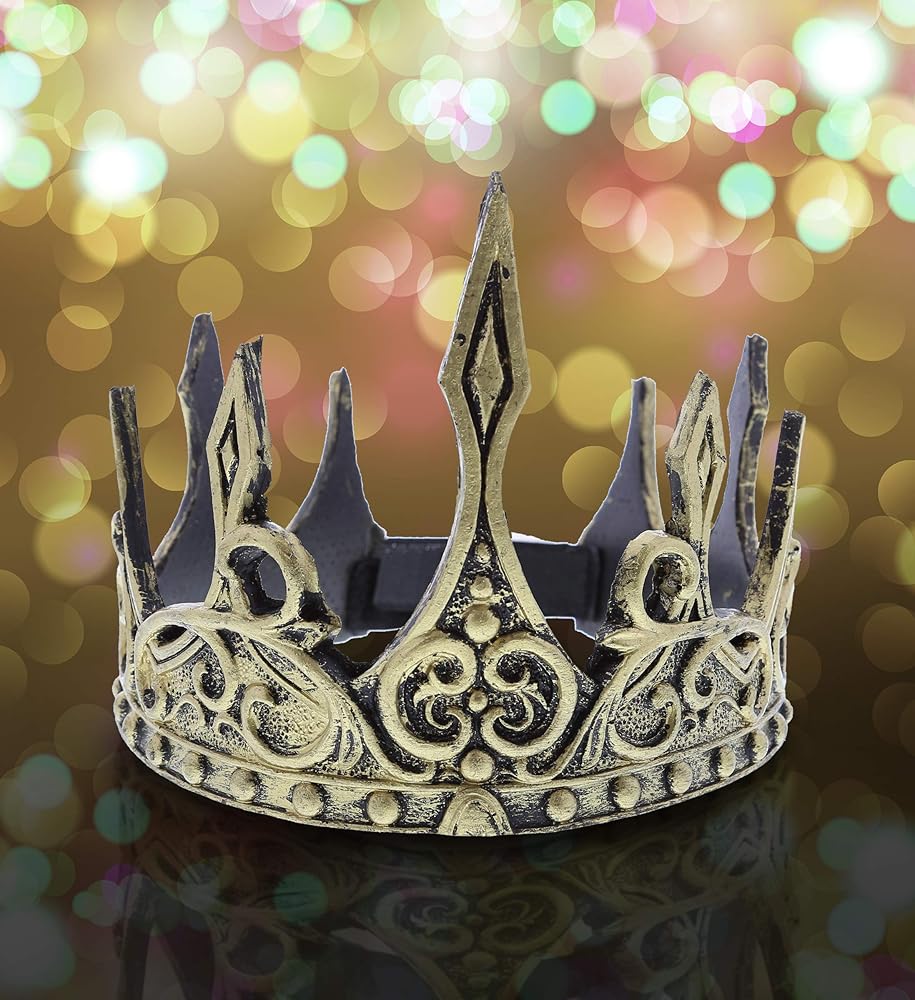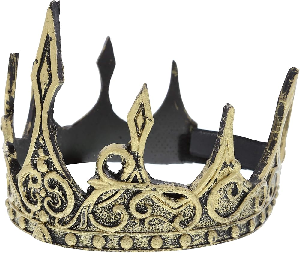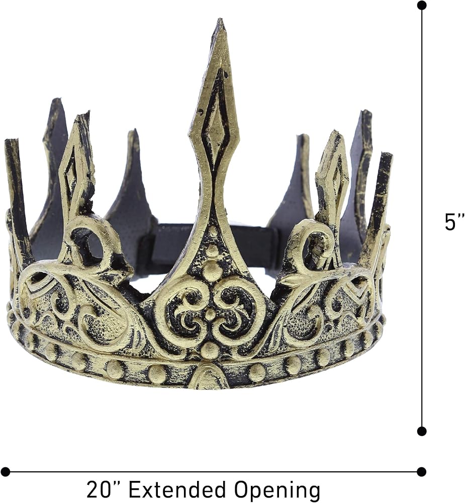 تشتمل العبوة على تاج حديث للبالغين يتميز بخصائص باروك حقيقية ولمسة نهائية ذهبية معدنية. يتميز التاج بملمس ريفي مع نقش معقد للشوك حول القاعدة مما يجعل هذا التاج فريدًا. غطاء الرأس الناعم والمريح يجعل هذا مثالي للارتداء لزي الملك أو الملكة من القرون المتوسط. يمكنك إقرانه مع معطف خارجي، حزام من الذهب، جوارب طويلة، عباءة حريرية لمظهر ملكي كامل.