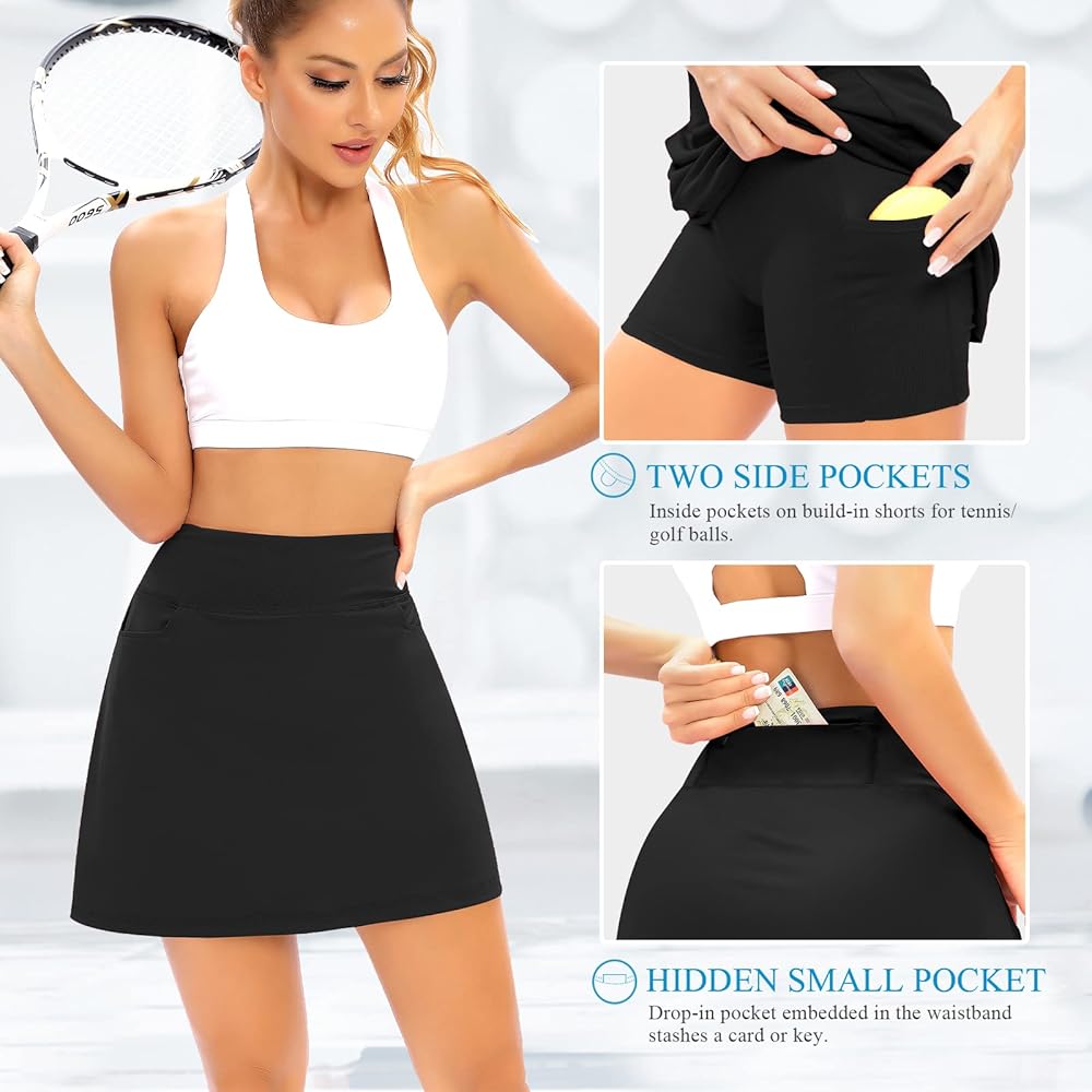 【تنانير سكورت بجيوب متعددة】 يوجد جيبان لليد في الجزء الخارجي من تنورة الجولف لتخزين هواتفك المحمولة بشكل مريح أو وضع يديك فيها بسهولة. والشورت الداخلي به جيبان لتخزين كرات التنس دون إعاقة الحركة أو القلق بشأنها. السقوط. بالإضافة إلى ذلك، تحتوي على جيب مخفي عند الخصر للمفاتيح وبطاقات الائتمان وغيرها من الأشياء الصغيرة.