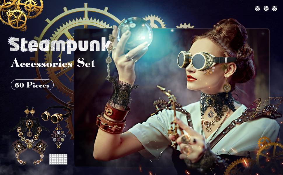 مادة قوية وصلبة: عدسة نظارات Steampunk Cyber Goggles مصنوعة من زجاج مقاوم، والإطار مصنوع من البلاستيك المطلي الصلب، وعصابة الرأس قابلة للتعديل؛ القلادة والقفازات السوداء الشريرة مصنوعة بشكل أساسي من الدانتيل الأسود، والسبائك، ومواد حجر الراين، والتي تتميز بالموثوقية والجودة، وليس من السهل أن تتلاشى أو تصدأ؛ والأقراط مصنوعة بشكل أساسي من سبيكة، مادة أكريليك، مادة موثوقة يمكن استخدامها لفترة طويلة، تروس البخار مصنوعة من سبائك الزنك