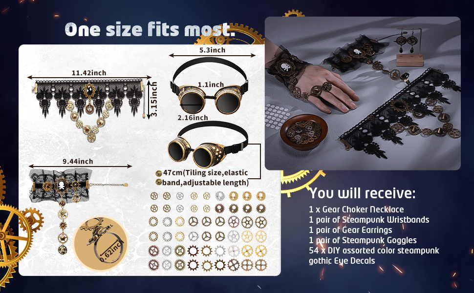 تفاصيل الأبعاد: يبلغ قياس كل نظارات سايبر ستيم بانك 5.3 بوصة/ 13.46 سم طولًا، 2.4 بوصة/ 6 سم عرضًا، 2.16 بوصة/ 5.5 سم ارتفاعًا، مقاس قابل للتعديل يناسب معظم الأشخاص، يختلف حجم ساعات وتروس Steampunk هذه حوالي 8- 14.7 مم/ 0.31-0.57 بوصة، زي Steampunk بمقاس مناسب، مناسب لمعظم النساء والفتيات