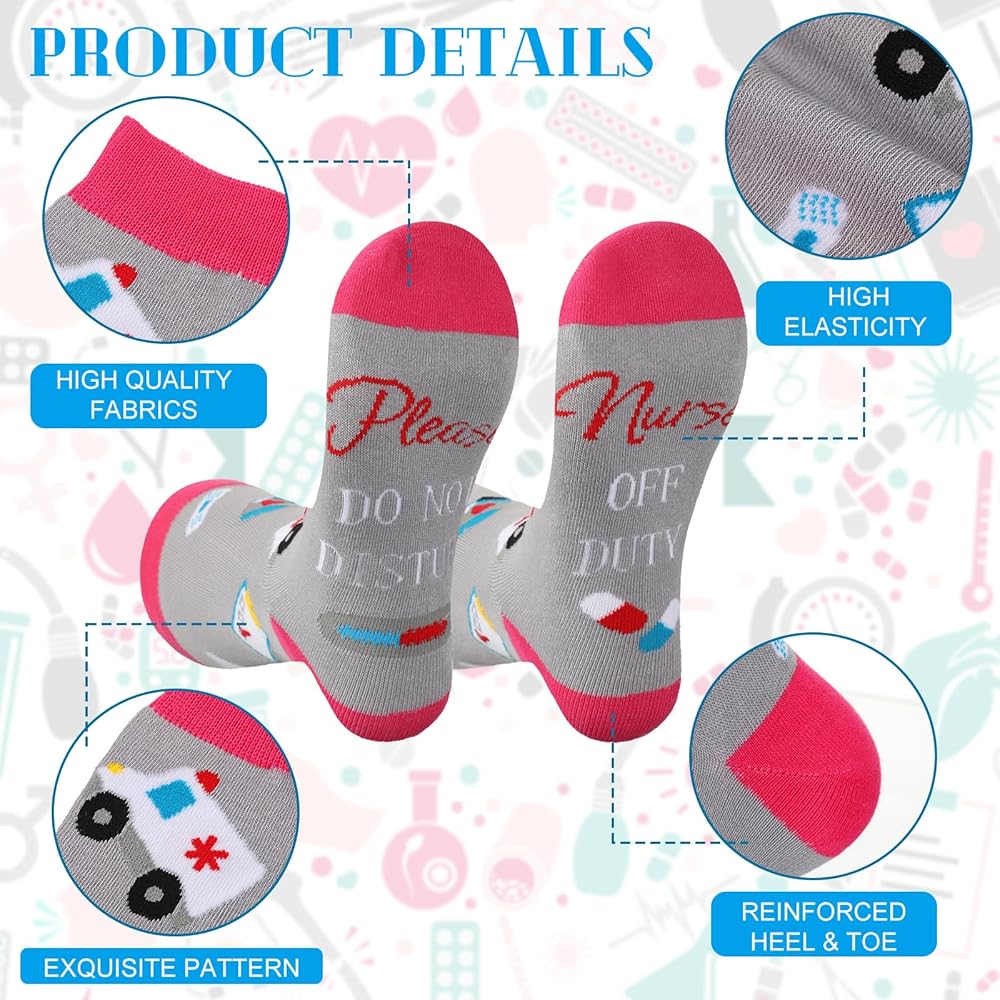تصميم مميز ولطيف: تم تصميم جوارب الممرضة خصيصًا بأنماط وكلمات بطابع الممرضة، مثل مجموعة الإسعافات الأولية، وسماعة الطبيب، وسيارة الإسعاف، والقفازات والقلب وقبعة الممرضة وأكثر من ذلك، مع الجزء السفلي مطبوع بكلمات متطابقة، رائعة ومرحة، تظهر شخصيتك وأسلوبك