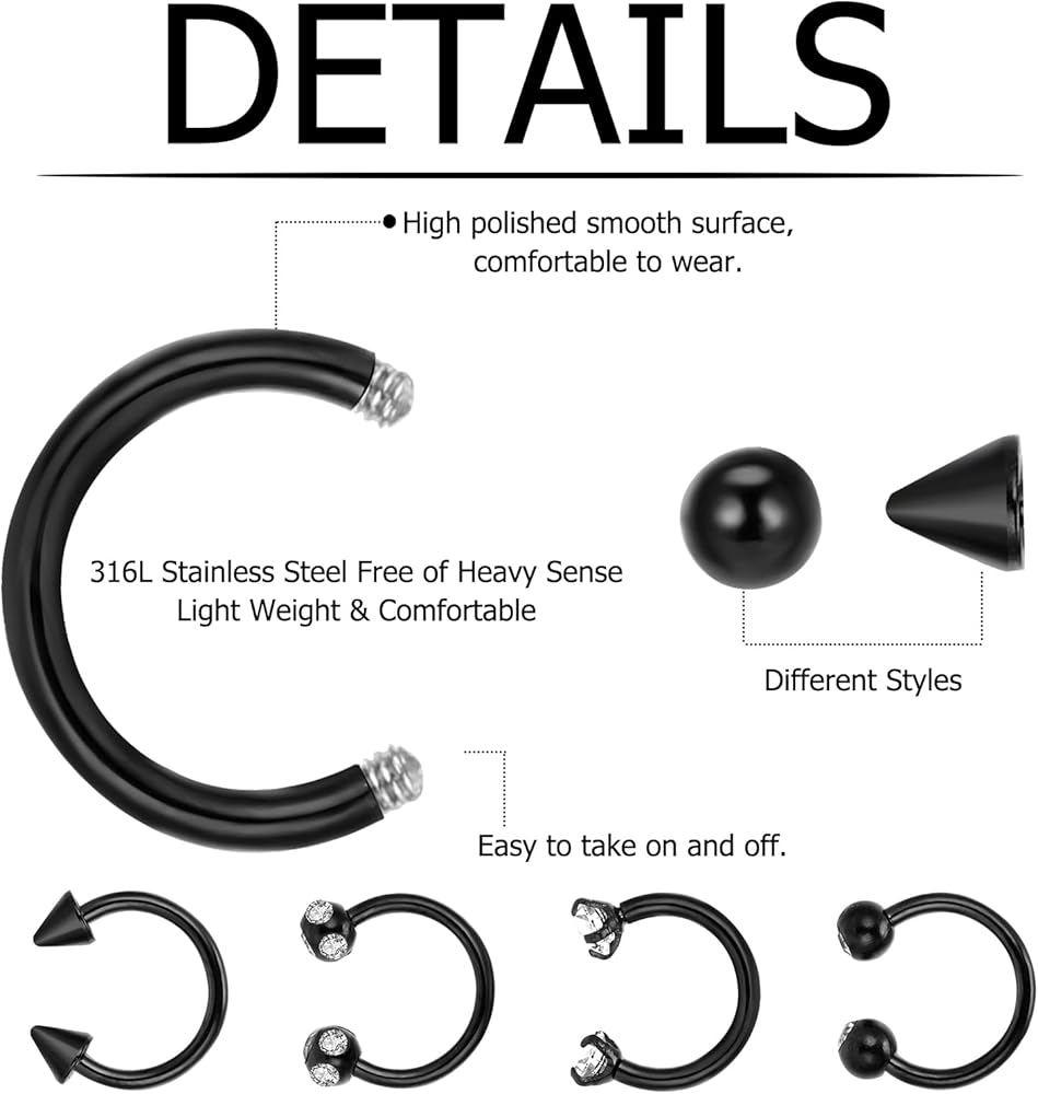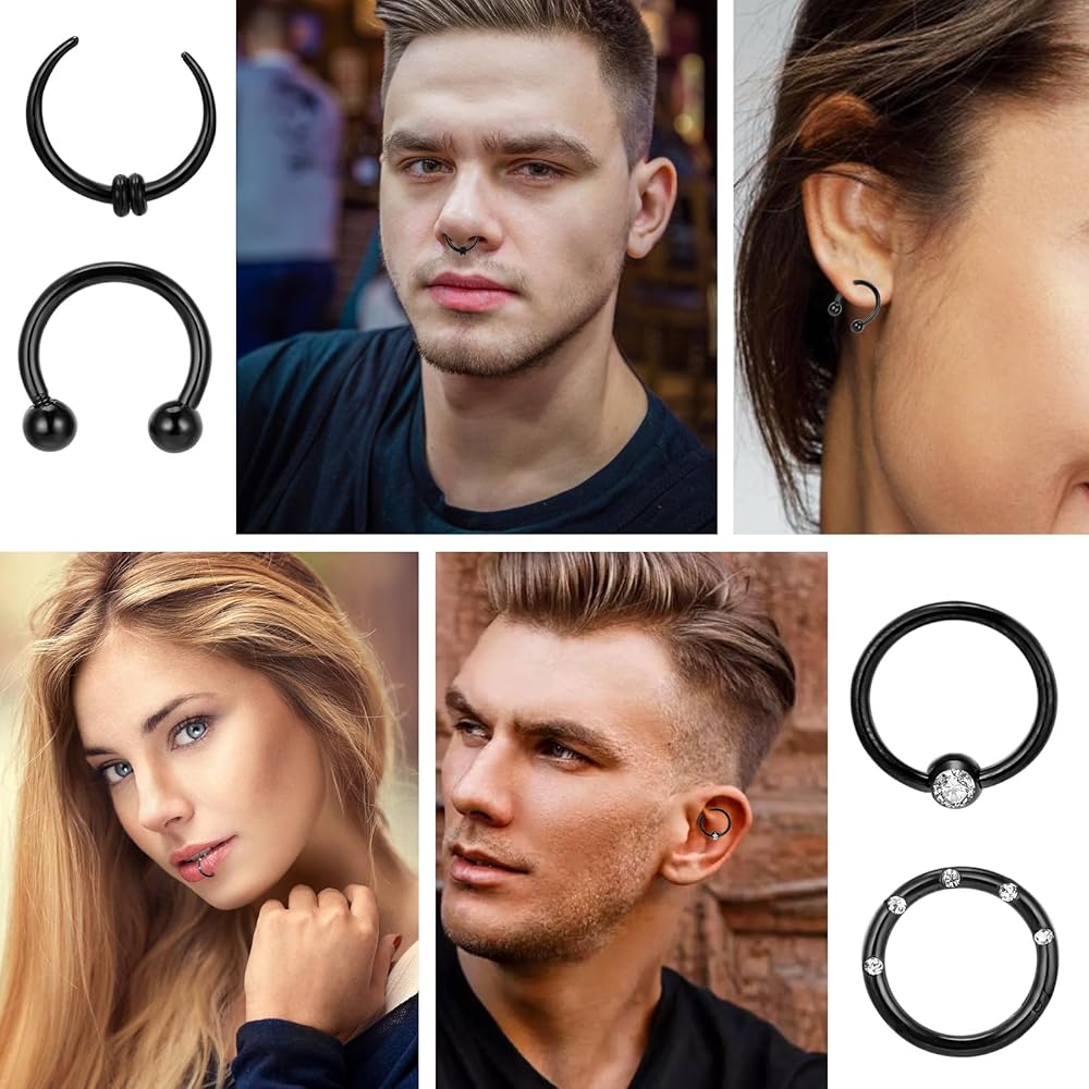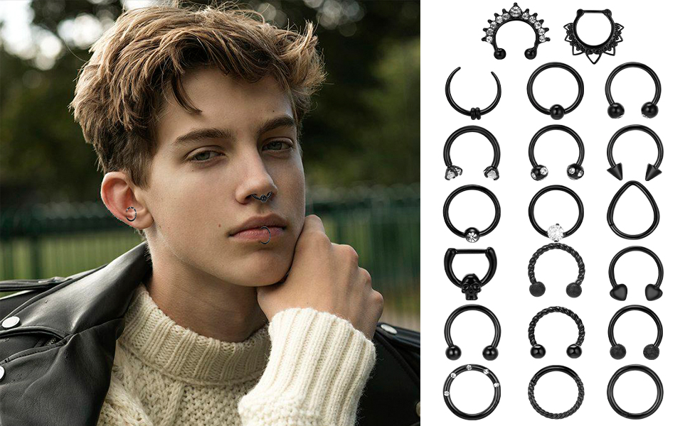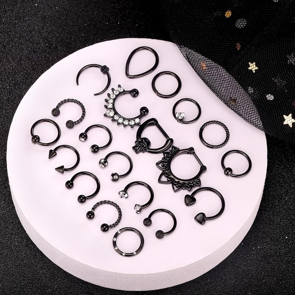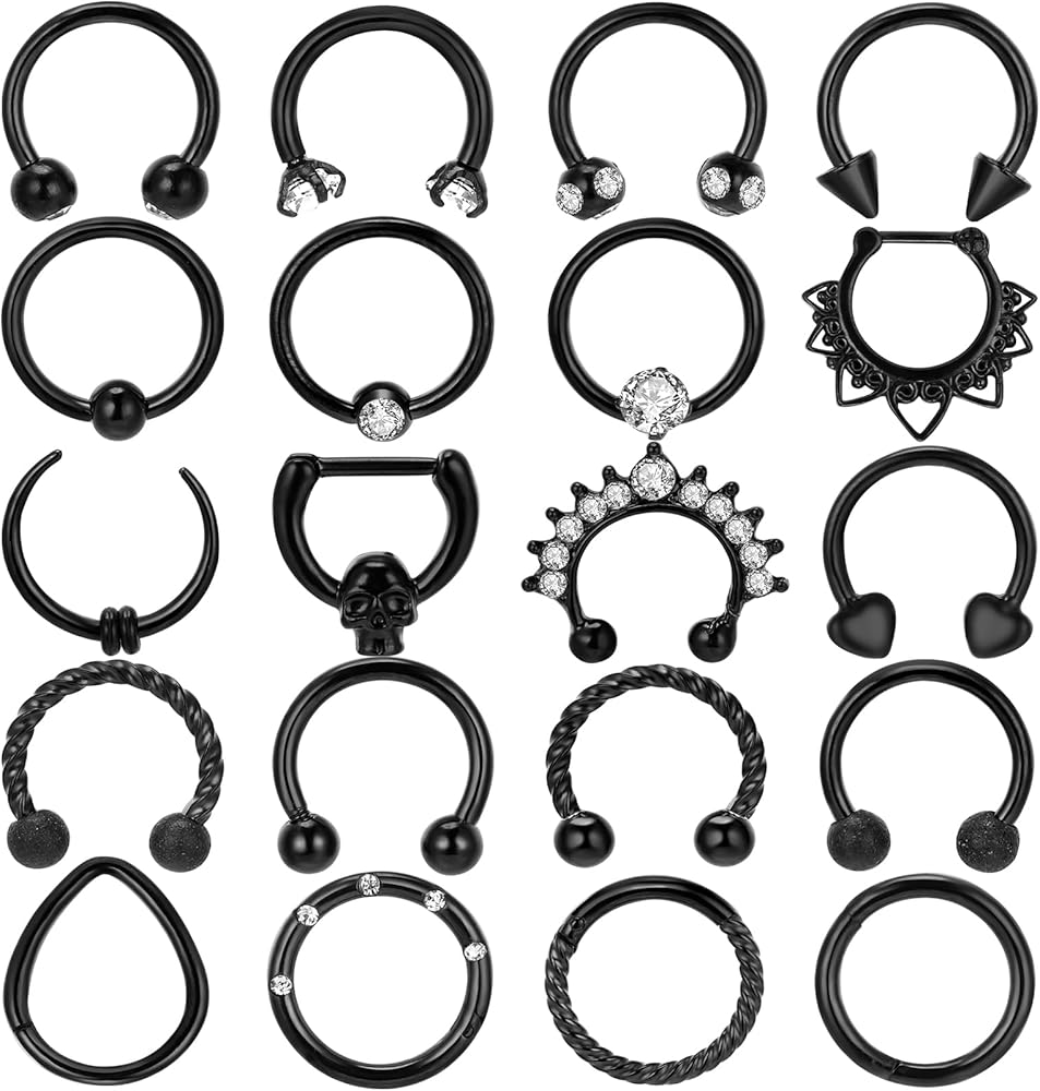 20 قطعة من حلقات حاجز الأنف - إجمالي 20 قطعة من مجوهرات ثقب الحاجز الأسود مع صندوق هدايا بلاستيكي شفاف صغير. هناك أنماط متعددة من حلقات الحاجز الأنفي بوزن 16 غرام، بما في ذلك حلقات الحاجز الأنفي على شكل حدوة حصان وحلقة أنف على شكل حدوة حصان وحلقات دائرية من الستانلس ستيل وحلقات الشفاه وما إلى ذلك.