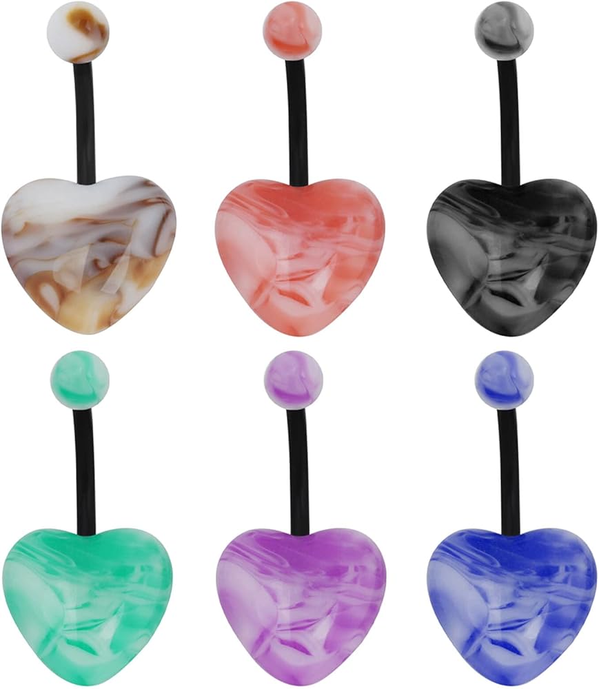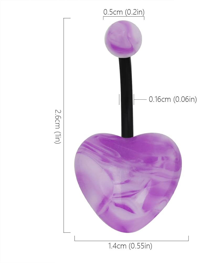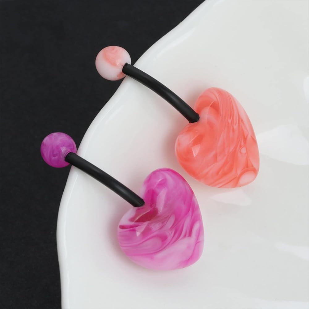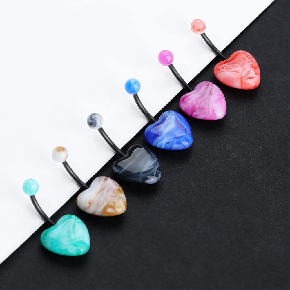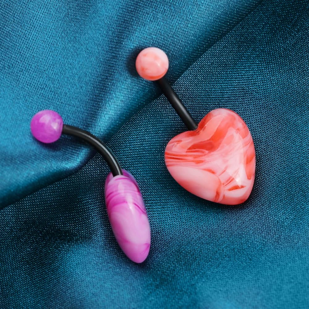 The two ends of this heart stone belly button rings are a spherical stone and a heart-shaped stone, and the rod is made of acrylic. They come in 6 colors for a rich palette of colors.