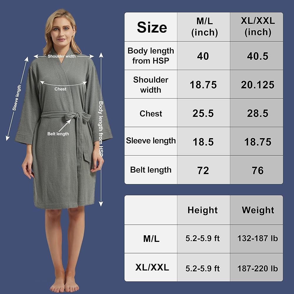 تعليمات المقاس: رداء سبا كيمونو وافل متوسط الطول للجنسين، مع حزام لتعديل إحكامه مجانًا. مقاس M-L (40 بوصة)، مقاس XL-XXL (40.5 بوصة)، مناسب لكل من الرجال والنساء. يرجى اختيار مقاسك بشكل معقول وفقًا لطول رداء الحمام المحدد.