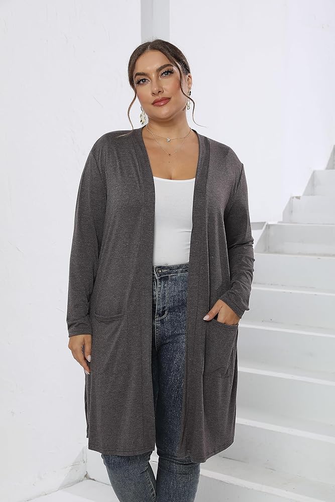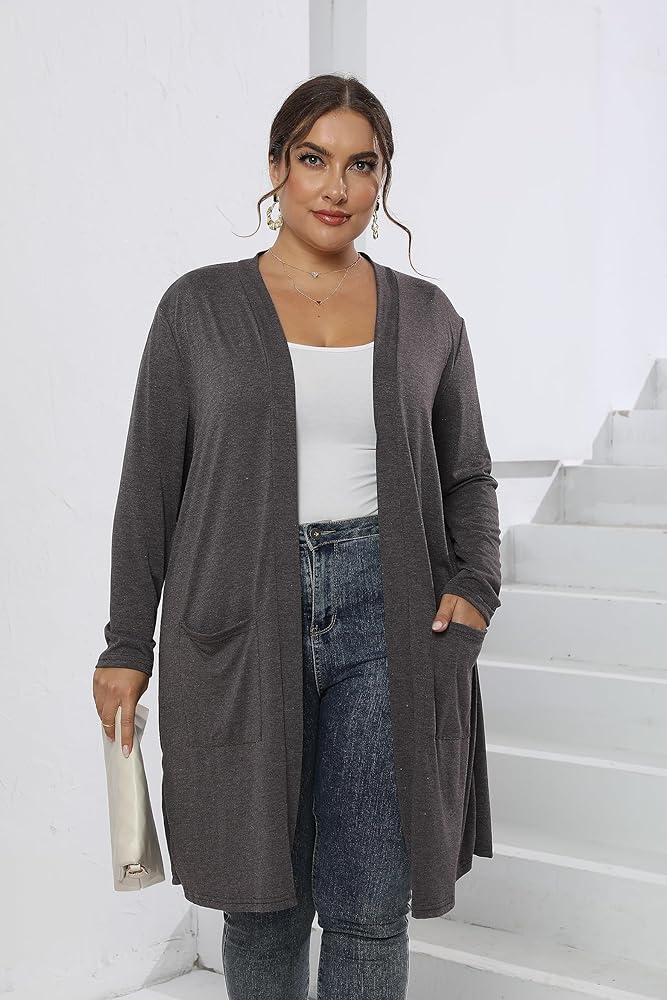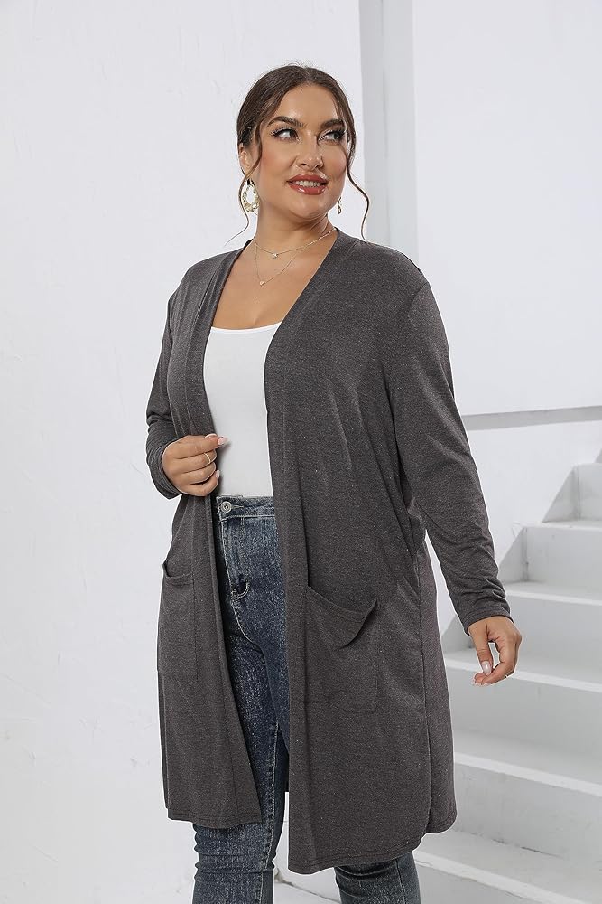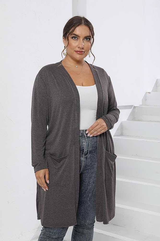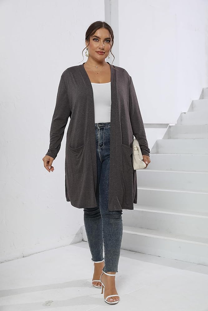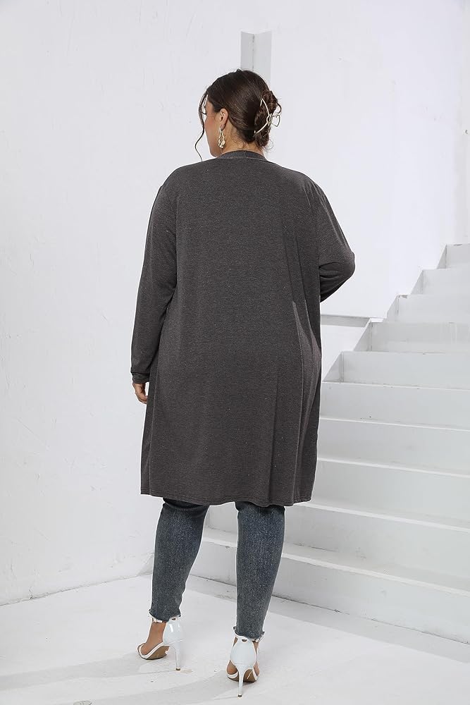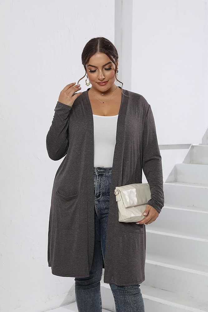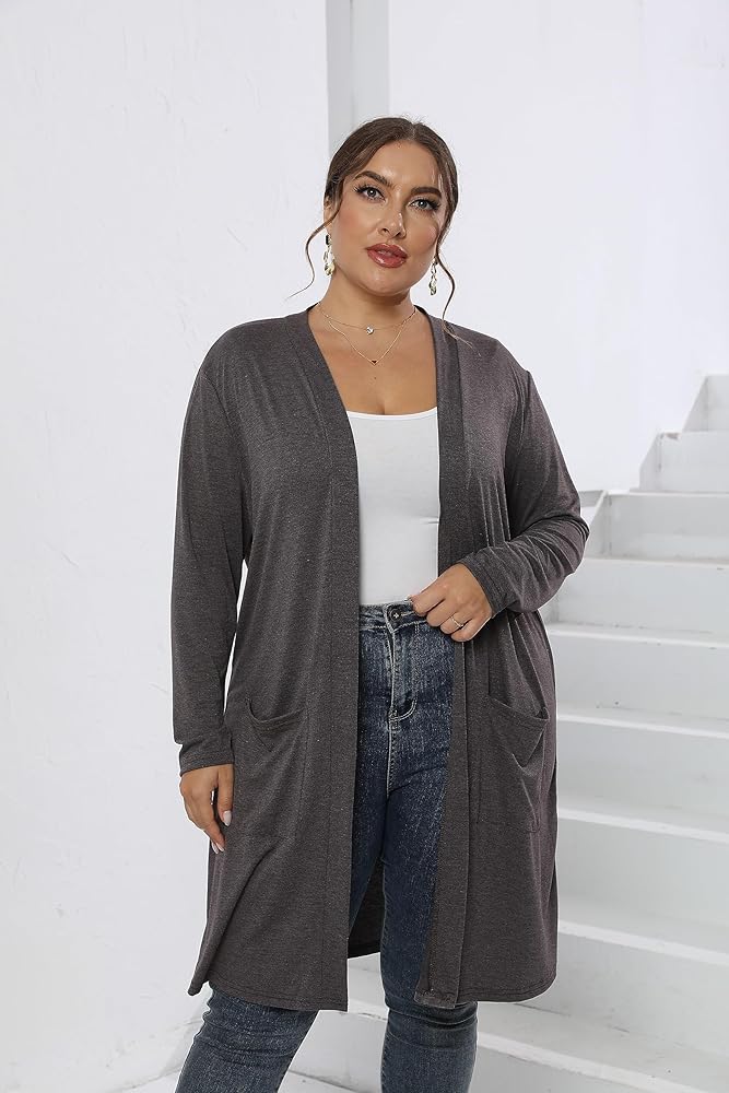 ملابس بمقاسات كبيرة، سترات فضفاضة كاجوال بأكمام طويلة للنساء مقاس كبير، خفيفة الوزن، مفتوحة من الأمام، لون ثابت، سترات صوفية أساسية كلاسيكية للنساء ذوات المقاسات الكبيرة مع جيوب. سترات نسائية خفيفة الوزن، سترات منفضة للنساء بمقاس كبير بطول الركبة.