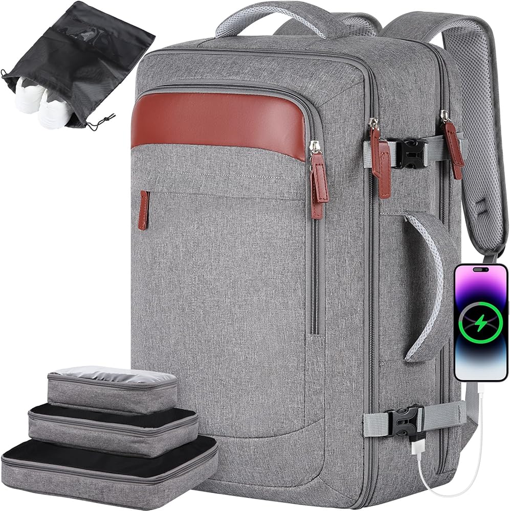 حقيبة ظهر محمولة، حقيبة ظهر للسفر سعة 40 لتر، حقيبة ظهر معتمدة للطيران مع 4 مكعبات تعبئة، حقيبة عطلة نهاية الأسبوع مقاومة للماء للنساء والرجال، حقيبة أمتعة للعمل في عطلة نهاية الأسبوع طوال الليل، حقيبة نهارية، رمادي