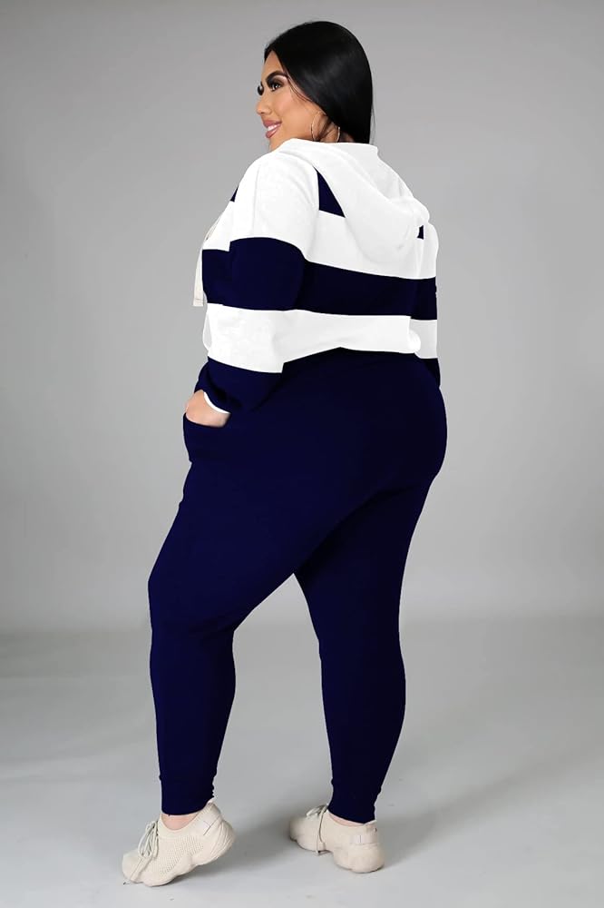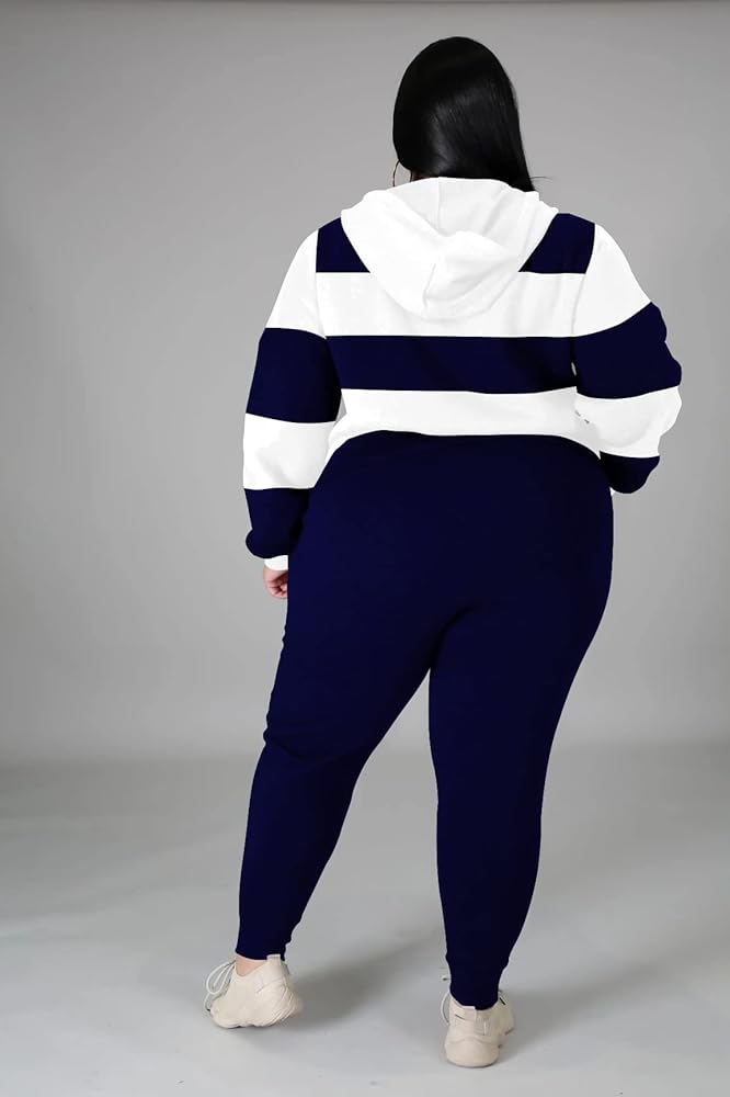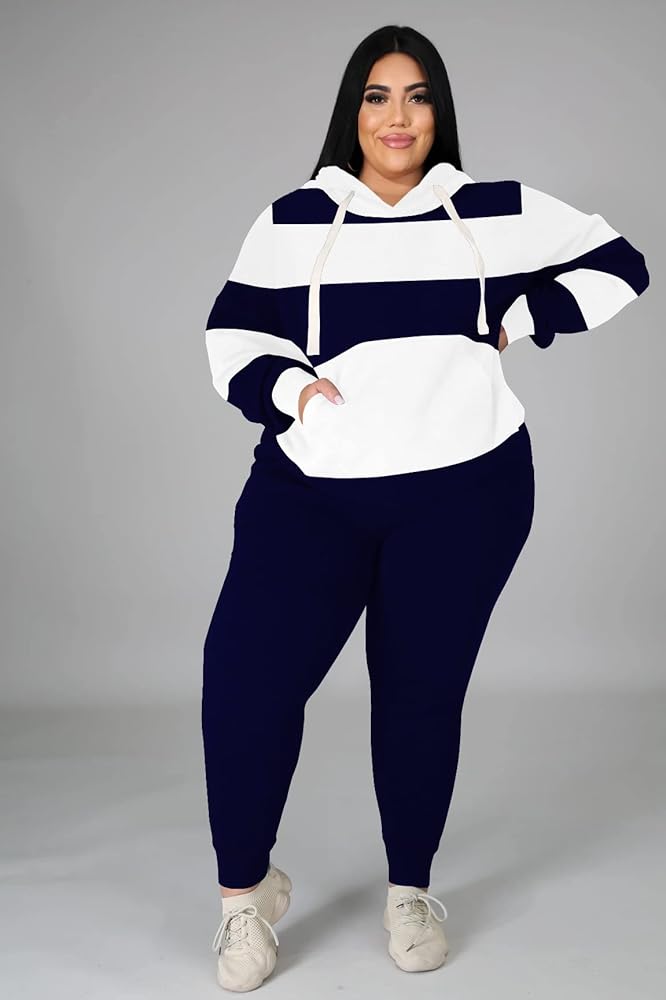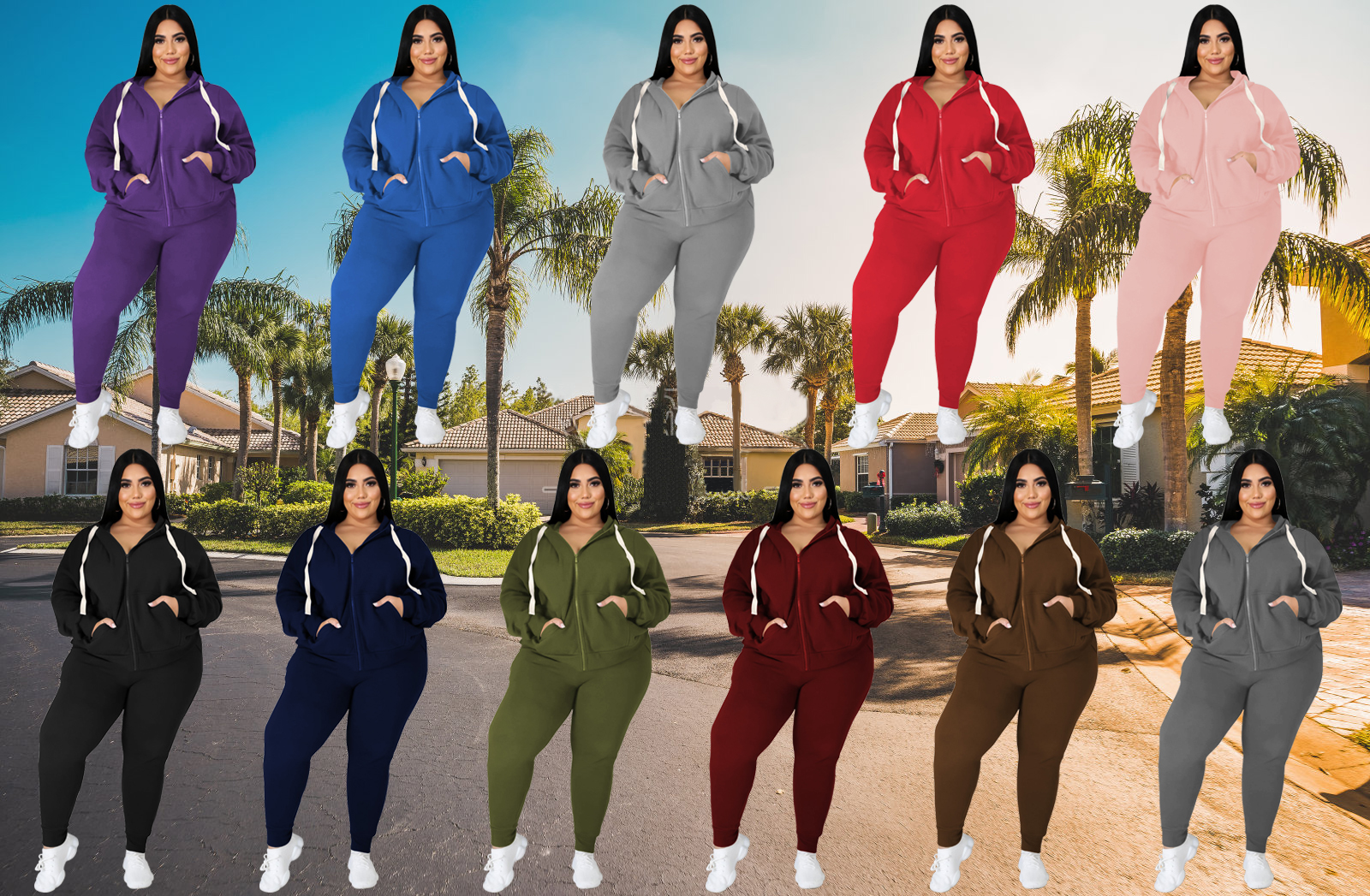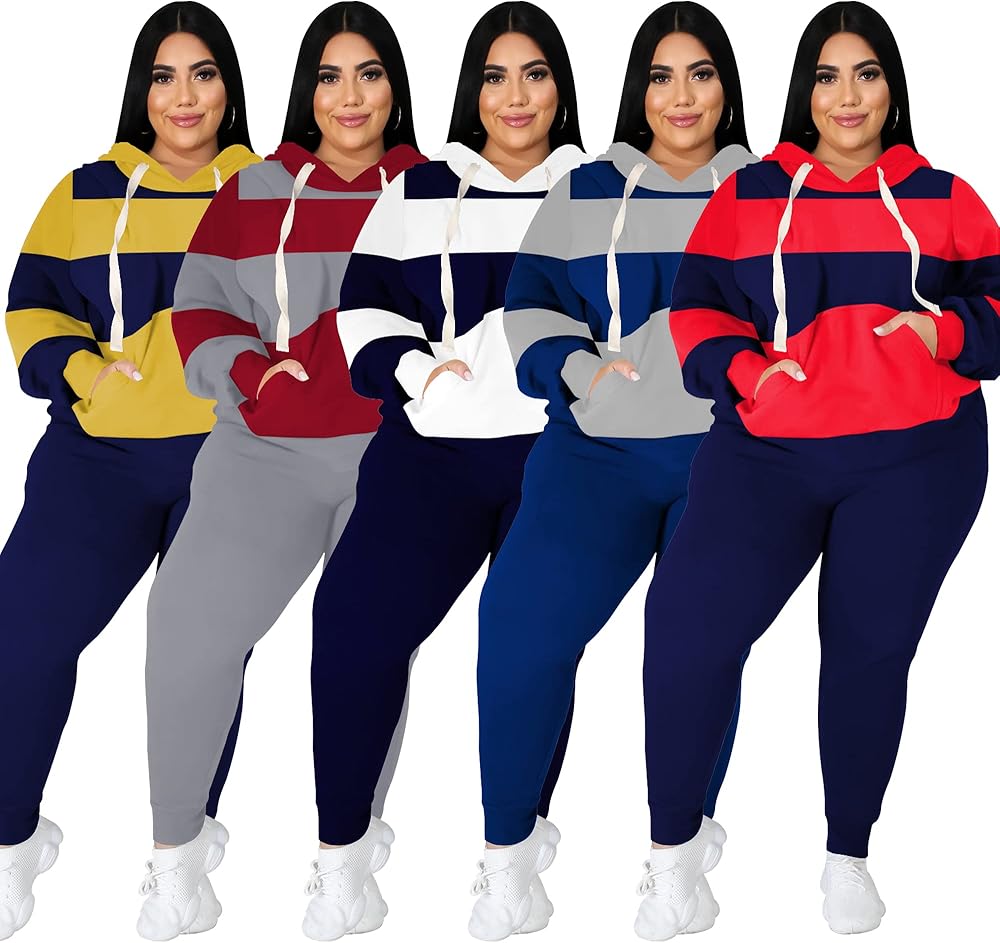 التصميم: ملابس نسائية بمقاس كبير مكونة من قطعتين، قمصان بقلنسوة بأكمام طويلة وسحاب + سراويل رياضية ضيقة، تتوفر مقاسات Xl-5xl.