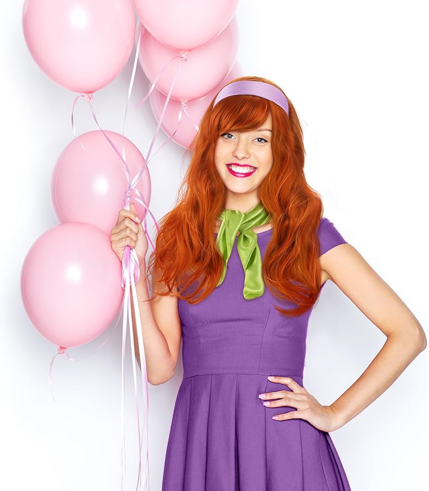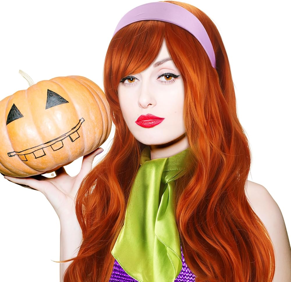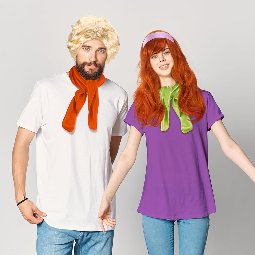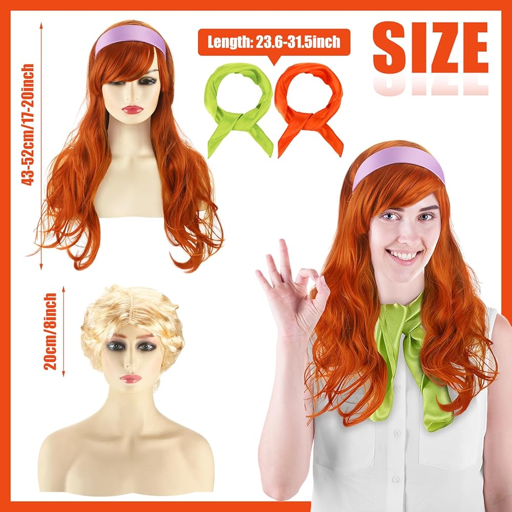 Tigeen 5 قطع من إكسسوارات الهالوين التنكرية للنساء والرجال زي المحققين الهالوين شعر مستعار برتقالي شعر مستعار أشقر ريترو طويل مجعد أرجواني عصابة رأس أخضر برتقالي وشاح للحفلات التنكرية