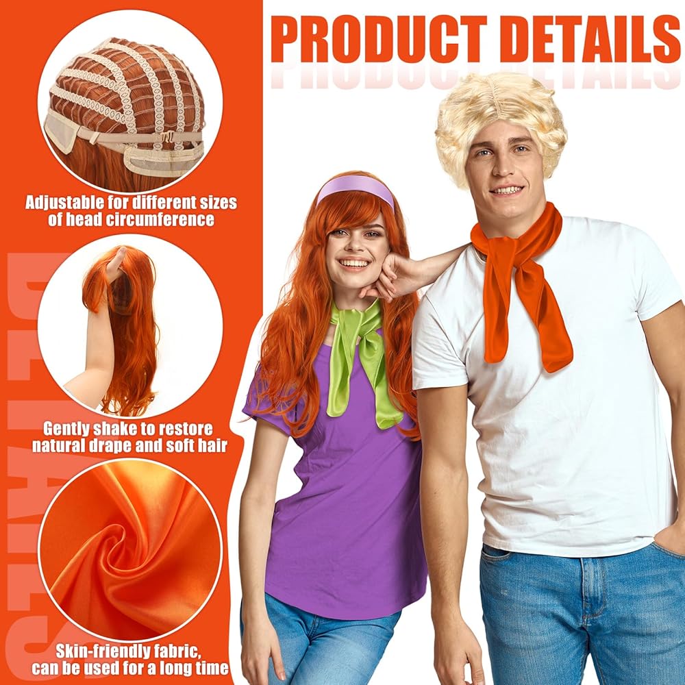 تشمل العبوة: يتضمن زي الهالوين شعر مستعار برتقالي طويل، و1 شعر أشقر مجعد، و1 عصابة رأس أرجوانية، و1 وشاح حريري برتقالي، و1 وشاح حريري أخضر، بحيث يمكن ارتداء مجموعة واحدة بمظهرين.