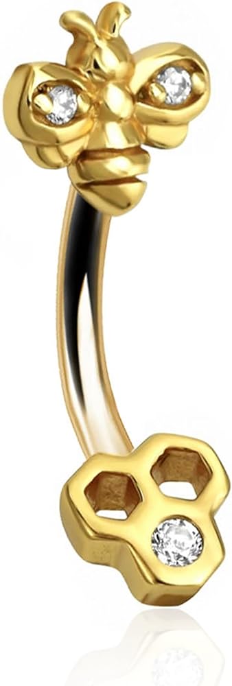 تقليديًا، يُقال أن مجوهرات النحلة الطنانة تجذب الثروة! هذه النحلة الصغيرة الجميلة واللطيفة موضوعة في قضيب ثقب روك بتصميم قرص العسل على الساق.