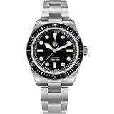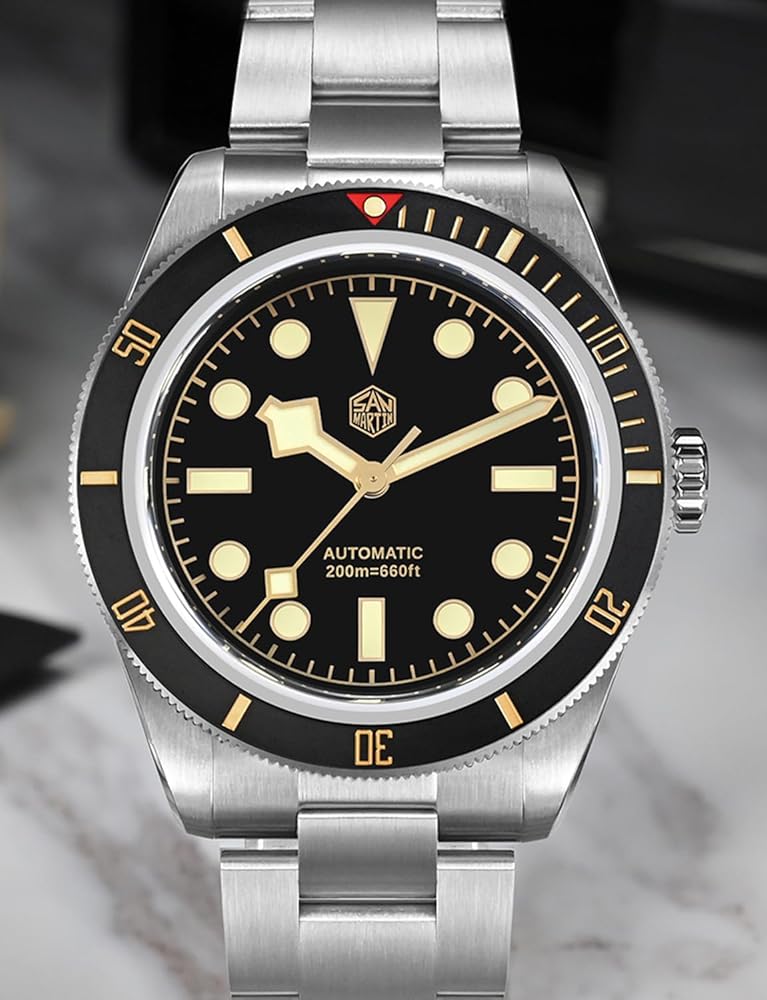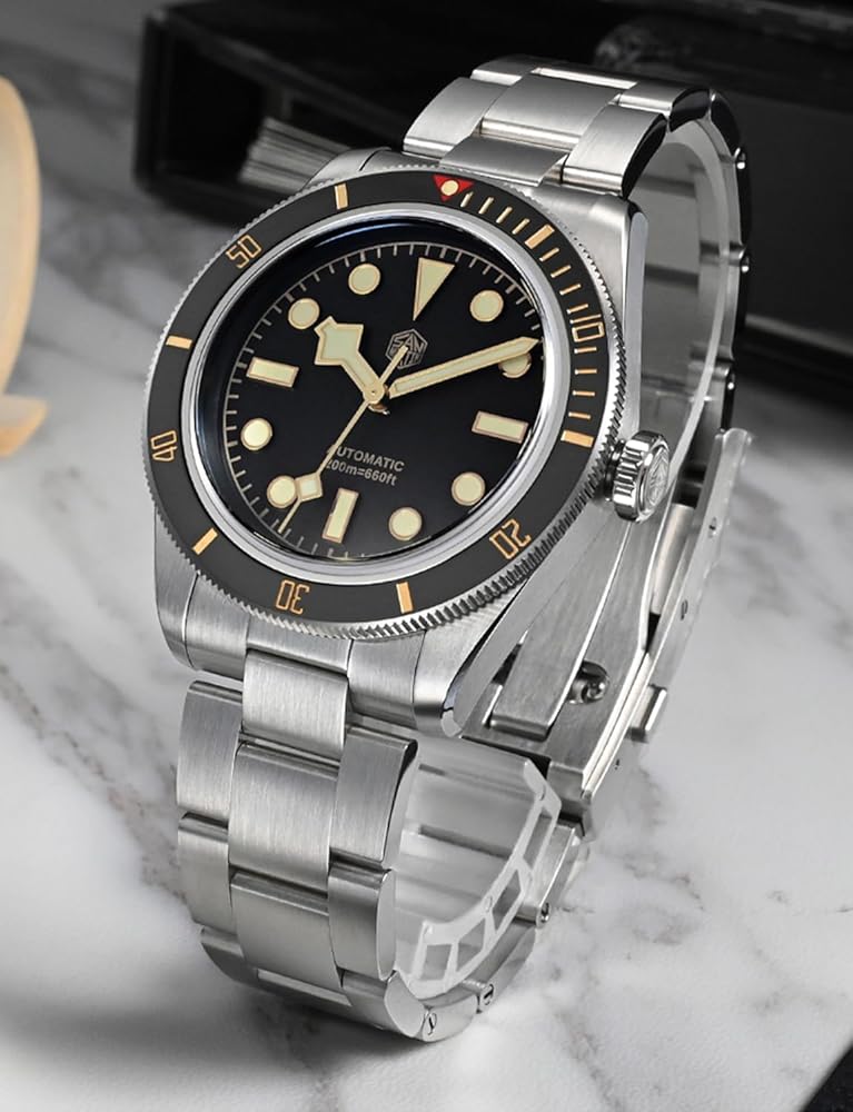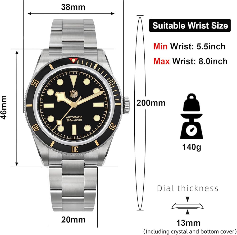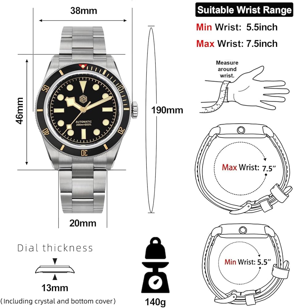 [𝗙𝗶𝗻𝗲 𝗪𝗼𝗿𝗸𝗺𝗮𝗻𝘀𝗵𝗶𝗽]: علبة الساعة الأوتوماتيكية لدينا مصنوعة من الفولاذ المقاوم للصدأ 316L ومرآة الساعة من كريستال الياقوت مع طلاء مضاد للانعكاس على السطح الداخلي. 120 نقرة على إطار سيراميك غير لامع دوار أحادي الاتجاه.