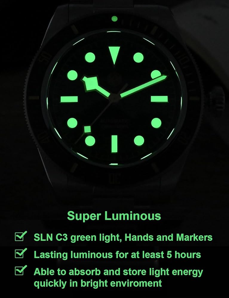 [𝗟𝘂𝗺𝗶𝗻𝗼𝘂𝘀 𝗪𝗮𝘁𝗰𝗵]: تتميز عقاربها وعلامات الساعة بضوء أخضر SLN C3 فائق الإضاءة، والذي يمكن أن يستمر لمدة 5 ساعات على الأقل في الظلام ويكون قادرًا على امتصاص الطاقة الضوئية وتخزينها بسرعة في بيئة مشرقة. تسمح لك ساعات اليد المضيئة بفهم الوقت دون خوف من الظلام.