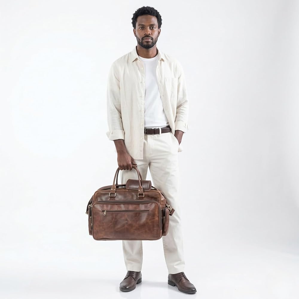 • الحجم والمواد: الحقيبة مصنوعة من جلد الجاموس المحبب بالكامل ومصنوعة يدويًا لضمان شكلها الجيد. الأبعاد: 17 بوصة طول × 7 بوصة عرض × 12 بوصة ارتفاع | الوزن الصافي حوالي 3.3 رطل