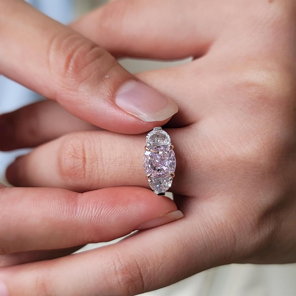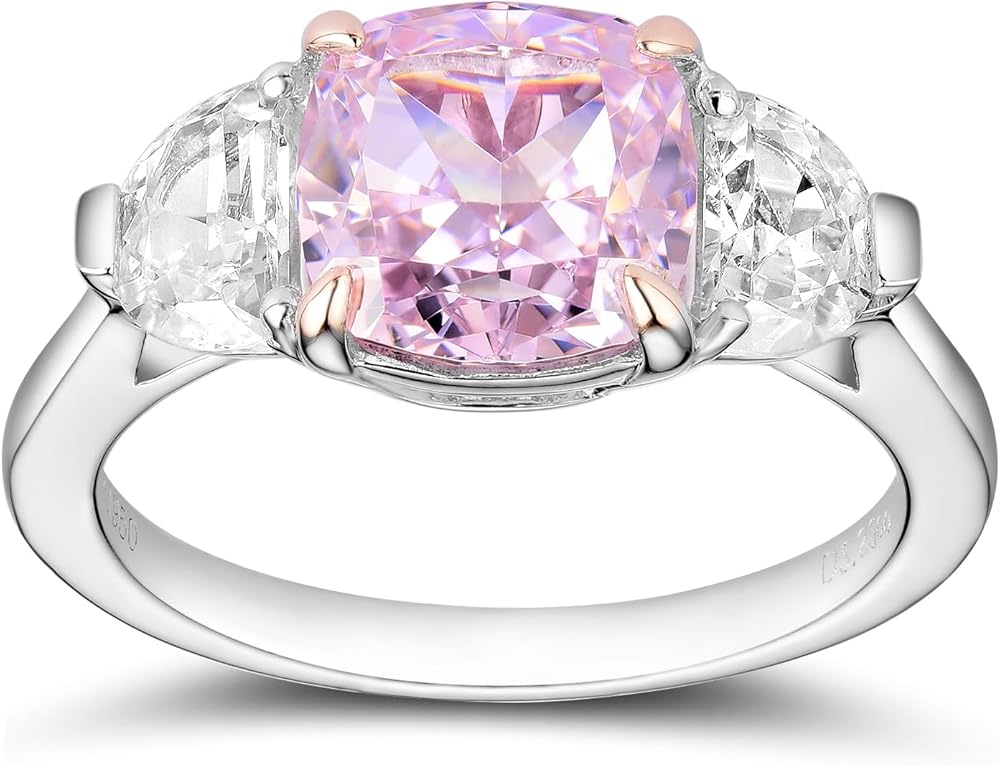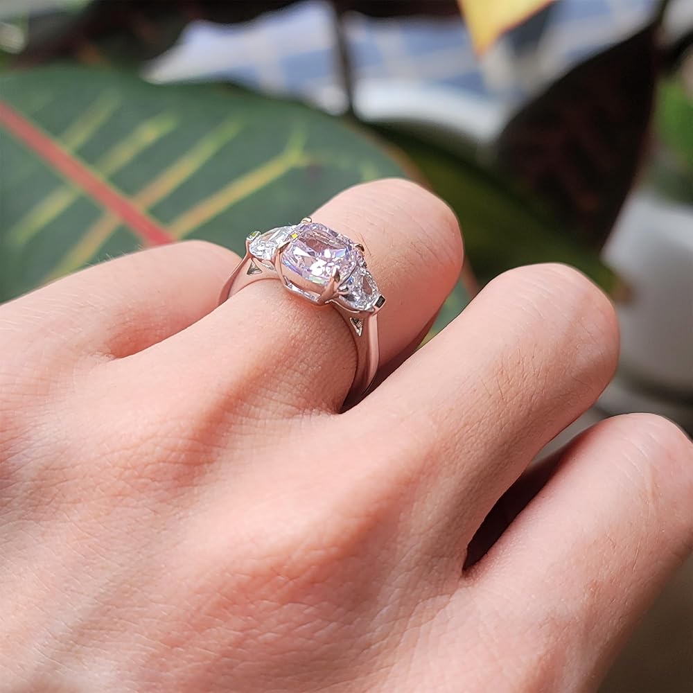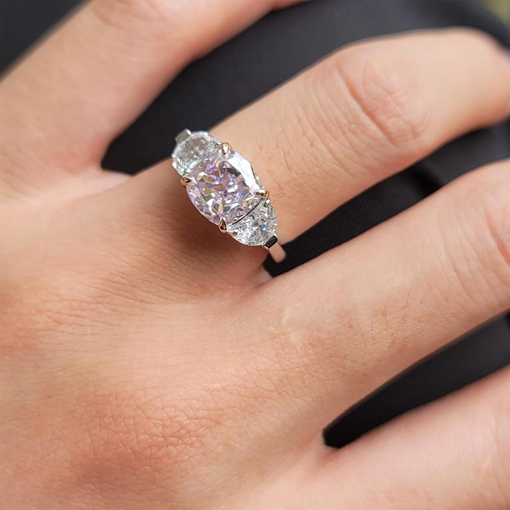 DovEggs ثلاثة خواتم خطوبة من الحجر للنساء 5.2ctw إجمالي المركز 8x8mm اللون الوردي جودة خاصة سحق الجليد وسادة قطع تشيكوسلوفاكيا مع 2 نصف القمر 14K جودة خواتم الزفاف الفضة الاسترليني الذكرى السنوية