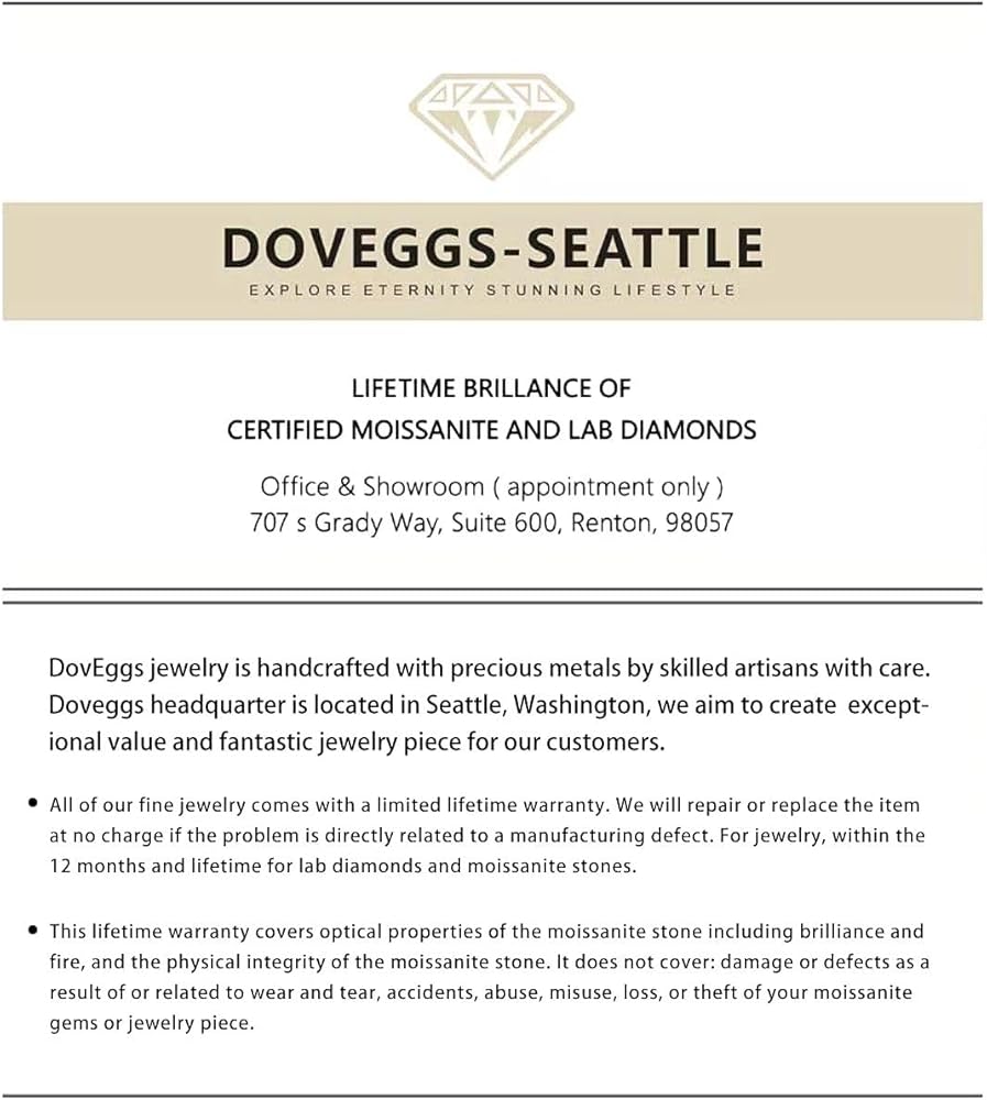 نحن نستخدم فقط الحجارة من النوع الجيد على الأقل إلى القطع الممتاز والتلميع والتألق. لن يبدو اللون المويسانتي من DovEggs GHI باللون الأصفر بشكل واضح. لن تبدو أحجارنا غائمة بسهولة أو تفقد بريقها، ويمكن استعادتها بسهولة بعد التنظيف السريع.