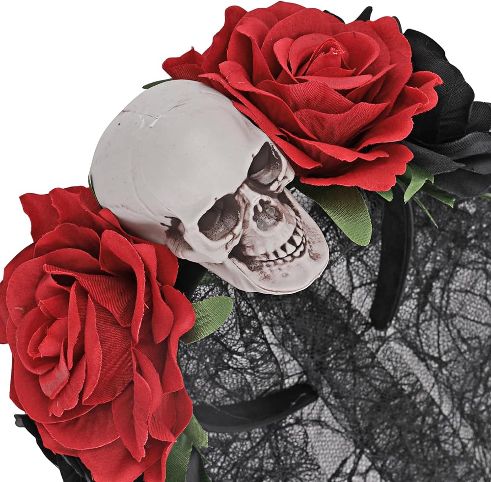 عصابة رأس للهالوين بتصميم جمجمة ووردة، لن تبهت الزهور الصناعية ولن يبهت لونها ويمكن إعادة استخدامها.