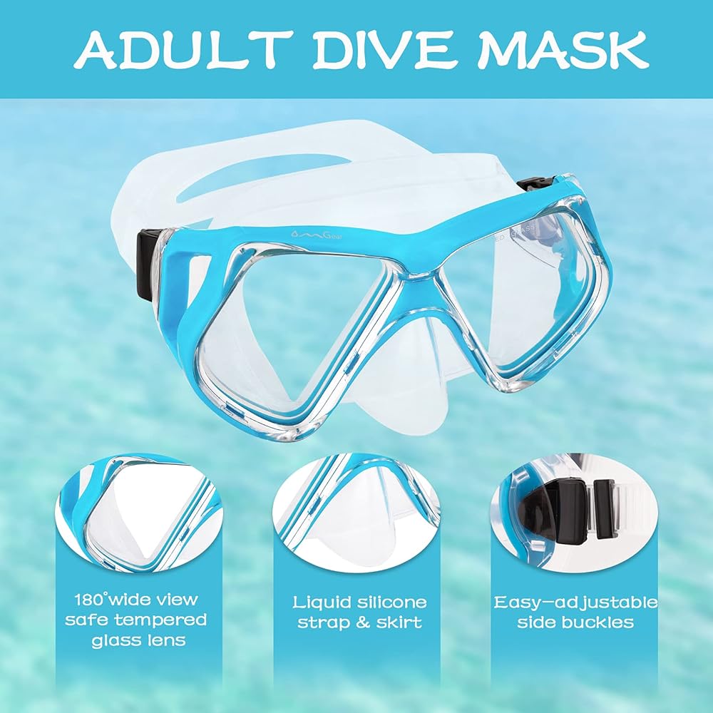 【قناع غوص من الزجاج المقوى المضاد للتسرب مع حزام من السيليكون】قناع الغطس المضاد للتسرب من OMGear مناسب تمامًا للصغار والكبار. يرجى تشديد القناع عن طريق سحب حزام السيليكون والتأكد من امتصاص تنورة السيليكون بالكامل على وجهك، ثم يضمن ذلك. حتى لا يتسرب الماء. قناع الغوص OMGear مزود بغطاء للأنف، وهو مثالي للمستخدمين الذين لا يعرفون كيفية التوقف عن التنفس عن طريق الأنف عند السباحة أو الغطس أو الغوص.
