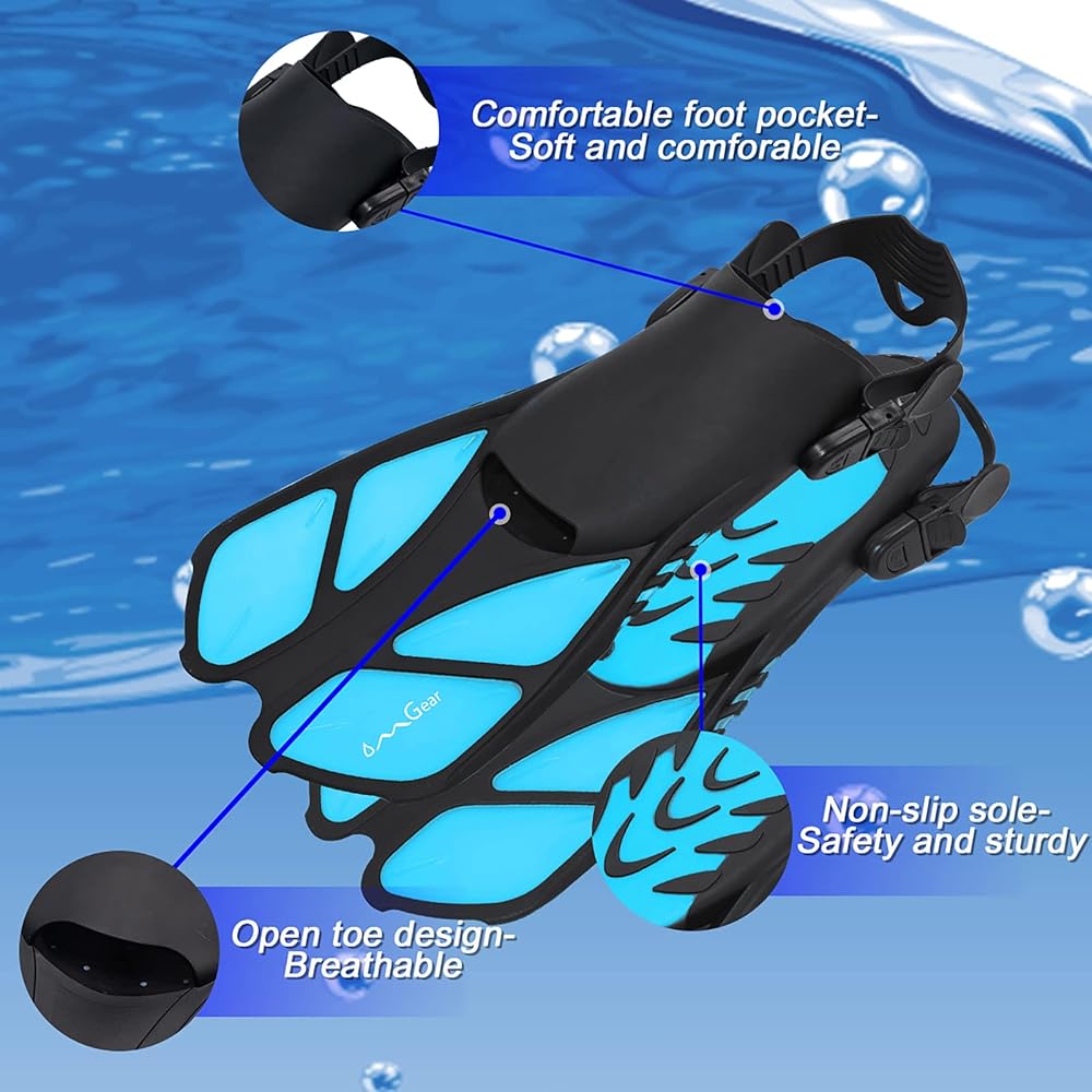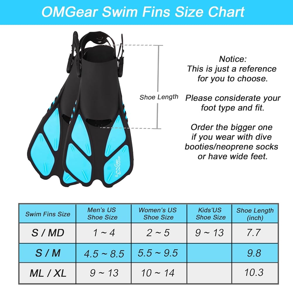 【زعانف سباحة قابلة للتعديل بكعب مفتوح】زعانف الغطس OMGear مصنوعة من المطاط اللدن حراريًا والبولي بروبيلين، مما يوفر بيئة مريحة لقدميك. جيب القدم ناعم بما فيه الكفاية ويمكنه حماية قدميك جيدًا. زعانف سباحة خفيفة الوزن ومرنة ومتينة تجعلك تشعر بالحرية تحت الماء. مقاس S/M وL/XL مناسب لمعظم البالغين، لذلك يمكنك مشاركة زعانف السباحة مع عائلتك وأصدقائك، أو يمكنك شراؤها لغرض الإيجار. تحقق من دليل المقاسات للحصول على أفضل أداء واختر مقاسًا أكبر بدرجة واحدة إذا كنت ترتديه مع أحذية الغوص.