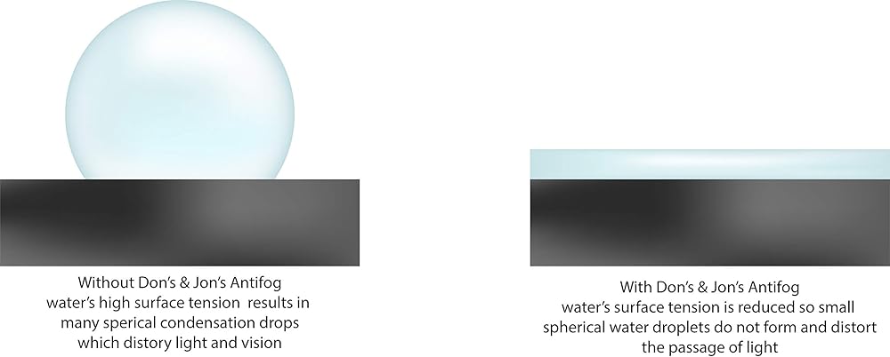 يحتوي DON & JON'S ANTIFOG EXTREME على مكونات أكثر نشاطًا مصممة للأسطح المعرضة لبيئات رطبة للغاية حيث يمكن أن يؤدي الرش إلى إزالة عامل مضاد الضباب من السطح الذي تحاول منع التكثيف عليه. يستخدم DON & JON'S ANTIFOG EXTREME كيمياء رائدة لمنع قطرات الماء الصغيرة من تتشكل على النظارات الواقية والأسطح الزجاجية والبلاستيكية والعدسات والمزيد. يحقق DON & JON'S ANTIFOG EXTREME ذلك دون استخدام المواد الحافظة الموجودة في جميع المنتجات الطبيعية المضادة للضباب. تستخدم جميع المنتجات الطبيعية المضادة للضباب مكونات يمكن أن تحفز النمو البيولوجي وبالتالي تستخدم المواد الحافظة التي تطلق الفورمالديهايد لمنع النمو. لأن العنصر النشط لدينا خامل، ليست هناك حاجة للمواد الحافظة. يعمل منتج DON & JON'S ANTIFOG EXTREME على تقليل التوتر السطحي للماء. بدون مياه DON & JON'S ANTIFOG EXTREME، يؤدي التوتر السطحي العالي إلى تكوين العديد من قطرات الماء الصغيرة التي تشوه الضوء وتضعف الرؤية. *اللون الطبيعي للمكون النشط هو اللون الكهرماني الذي لا يمكن رؤيته بمجرد وضعه على السطح.