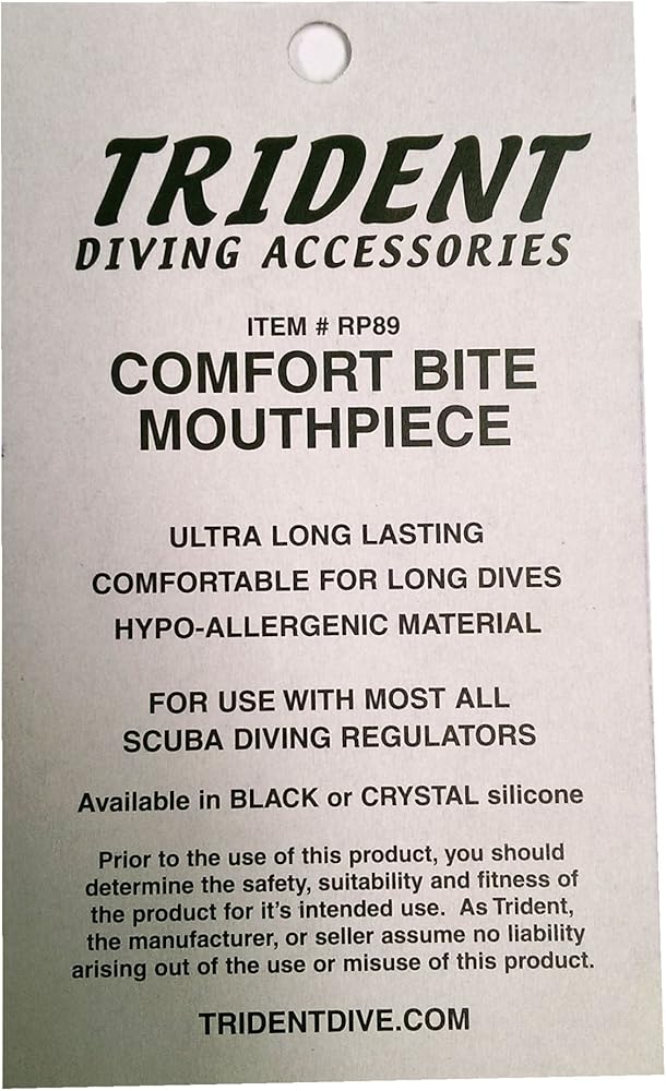 This is the Comfort Bite Mouth Piece with Roof of Mouth Bridge and Rolled Edges. Roof of mouth bridge. Rolled edges for a comfortable fit. Ultra-long lasting. Hypo-allergenic material. For use with most all scuba diving regulators. Available in Black or Clear. Comes with zip tie. Ultra comfortable for long dives.