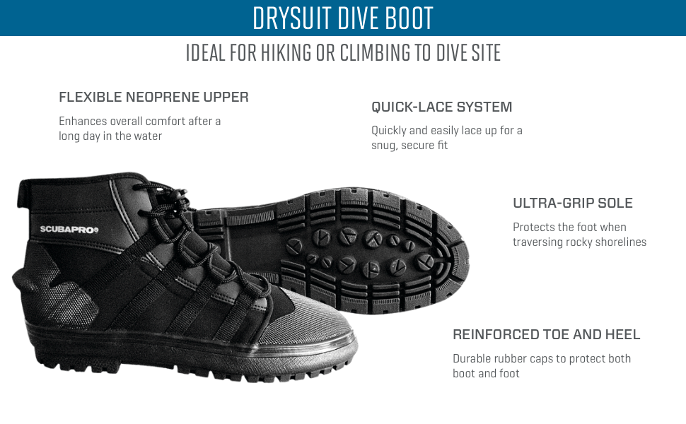 تم تصميمه ليتناسب بشكل مريح مع جورب النيوبرين أو اللاتكس لأي بدلة جافة، هذا الحذاء الثقيل للغوص ذو البدلة الجافة يتعامل مع التضاريس الشاطئية الأكثر وعورة وهو مثالي للمشي لمسافات طويلة أو التسلق إلى موقع الغوص.