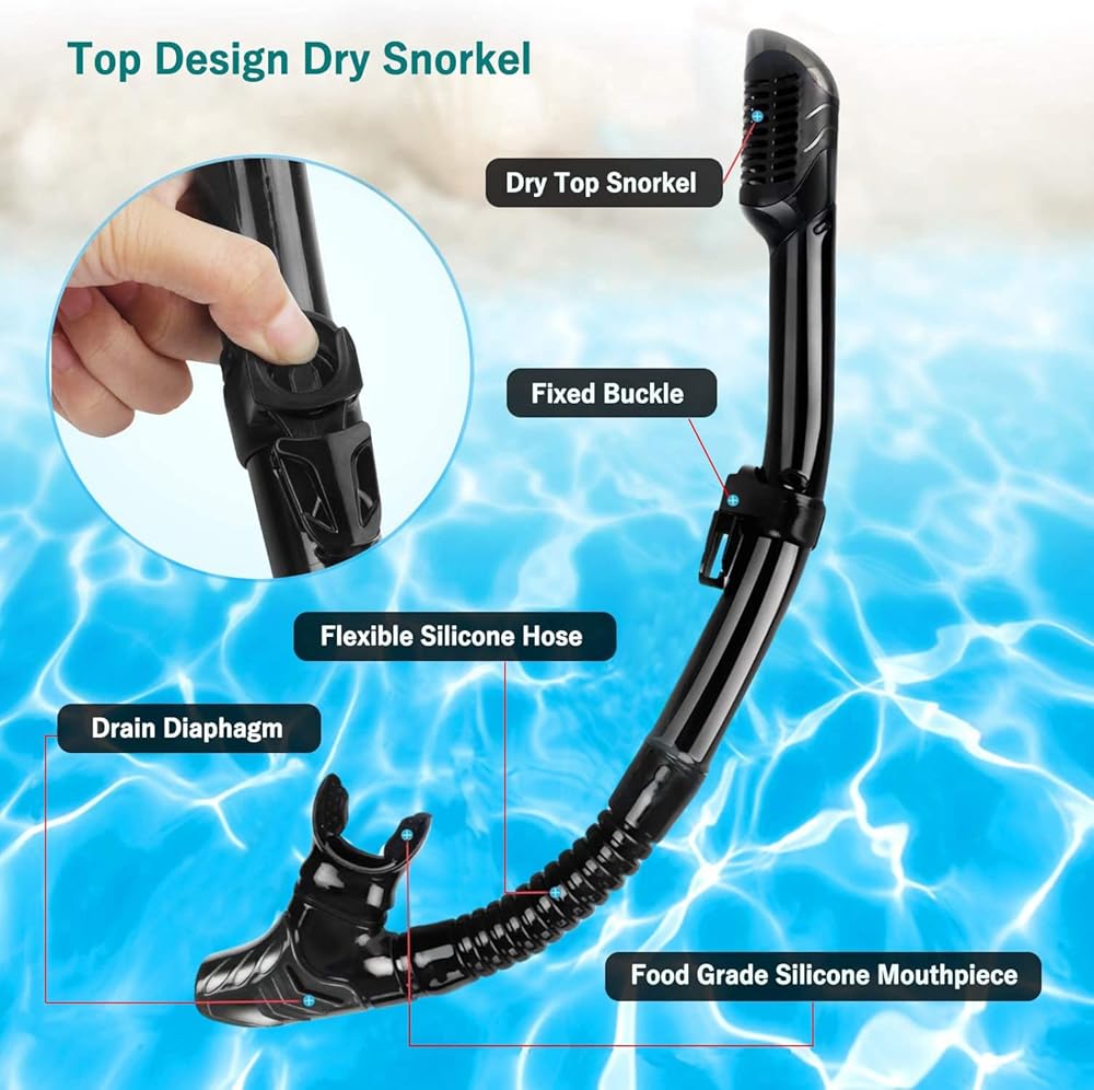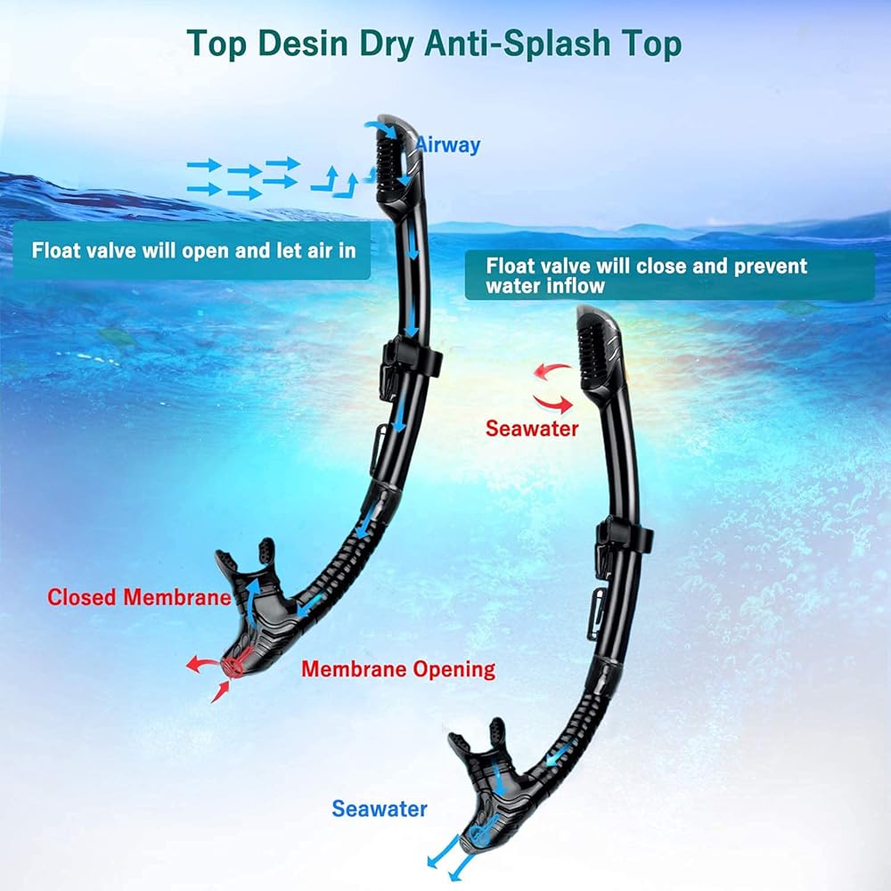 🏊 انبوب تنفس علوي جاف وسهل التنفس - يعتمد انبوب الغطس على تصميم الصمام العائم الجاف المستقر ويمكن تثبيته على قناع الغطس بواسطة مشبك، وسهل التنفس والعادم. حتى بالنسبة للمبتدئين، فإن التنفس تحت الماء سيكون مفيدًا جدًا. قطعة الفم المصنوعة من السيليكون الملائمة للطعام آمنة وغير سامة ومريحة ومتينة، ويمكنك الاستمتاع بالاسترخاء والتنفس الحر أثناء الغوص والغطس تحت الماء.