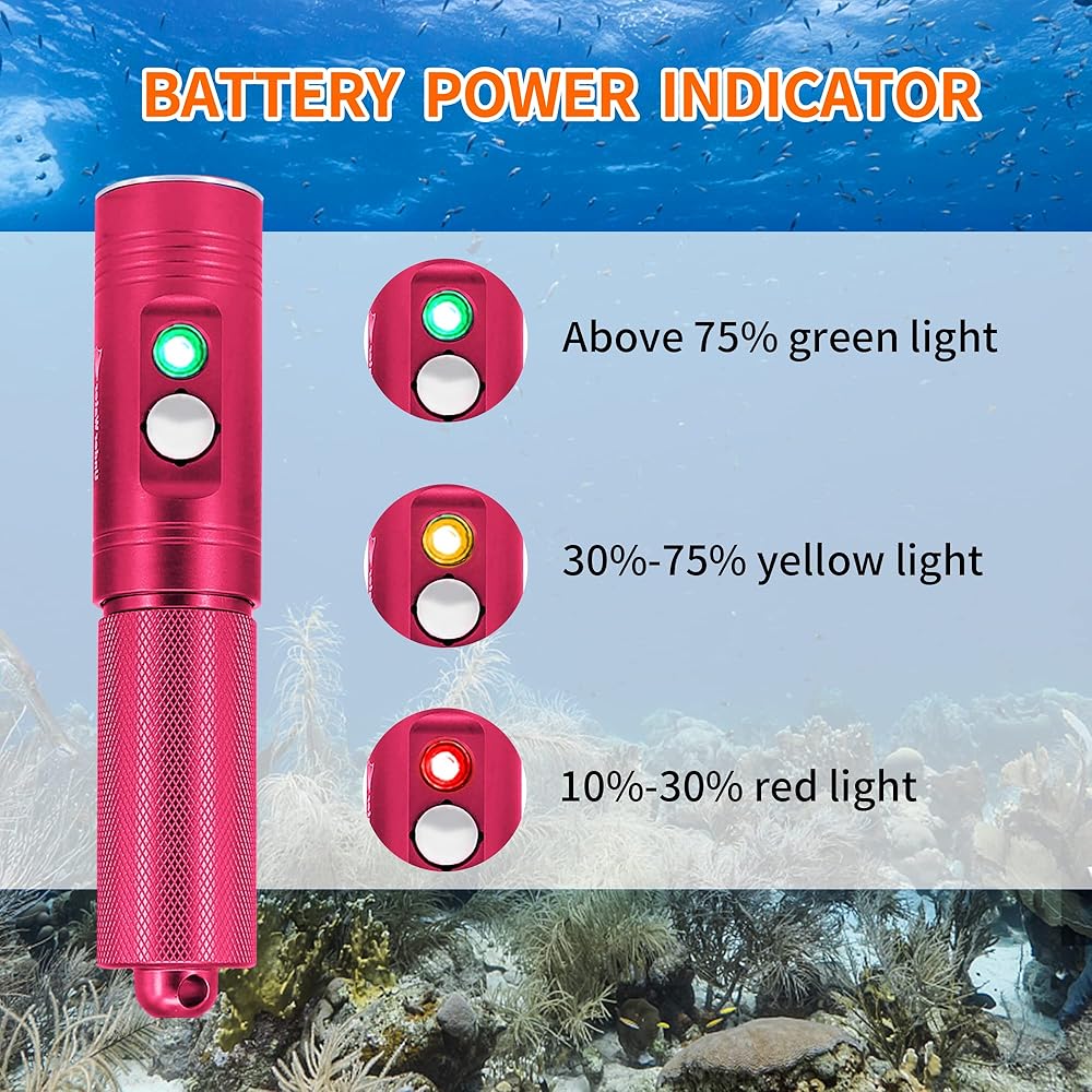 مؤشر الطاقة: ستصبح حياتك أسهل بكثير بفضل قدرة البطارية على إعادة الشحن وشاحن USB المرفق معها. سمحت مستويات مؤشر الكهرباء المنخفضة للغواصين بالتخطيط للمستقبل. أكثر من 70% ضوء أخضر، 40%-70% ضوء أصفر، 10%-40% ضوء أحمر، و5%-10% ضوء أحمر يبدأ في الوميض. إذا كانت البطارية منخفضة، فسيتم إيقاف تشغيل المصباح.
