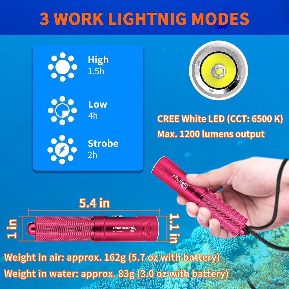 جودة عالية: استخدم مصابيح Cree LED عالية الجودة لتوليد ضوء كشاف 16 درجة و1200 لومن من الضوء الأبيض. المعالجة بدرجة حرارة عالية على عاكس نهائي للطاحونة تخلق ضوءًا قويًا يمكن أن يخترق الماء العكر. يتم توفير تصنيف مقاوم للماء تحت الماء بطول 100 متر (328 قدمًا) من خلال حلقة دائرية مزدوجة.
