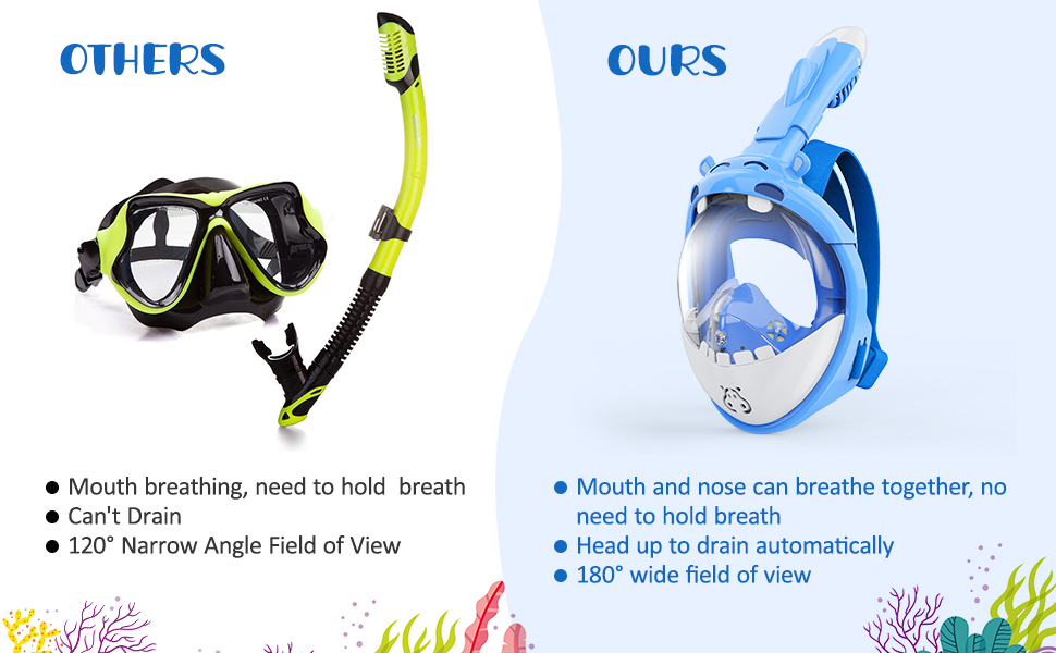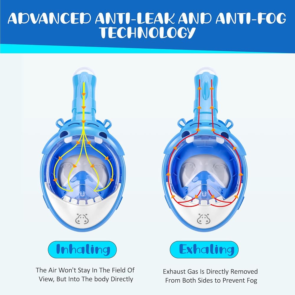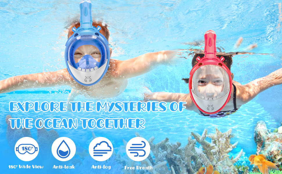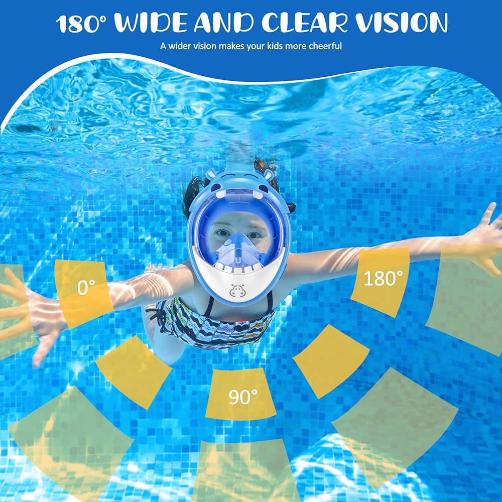 • 【تصميم بانورامي لكامل الوجه بزاوية 180 درجة】- قناع الغطس للأطفال الخاص بنا يستخدم عدسات مسطحة شفافة لن تشوه رؤيتك تحت الماء، مما يزيل أي دوخة أو إزعاج، قناع الغطس لكامل الوجه سيوفر لطفلك رؤية أفضل 180 درجة من رؤية أقنعة الغطس القياسية. والتي يمكن أن تفتح عالمًا جديدًا من المغامرات تحت الماء للأطفال.