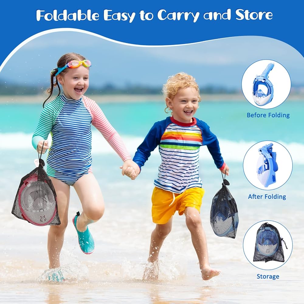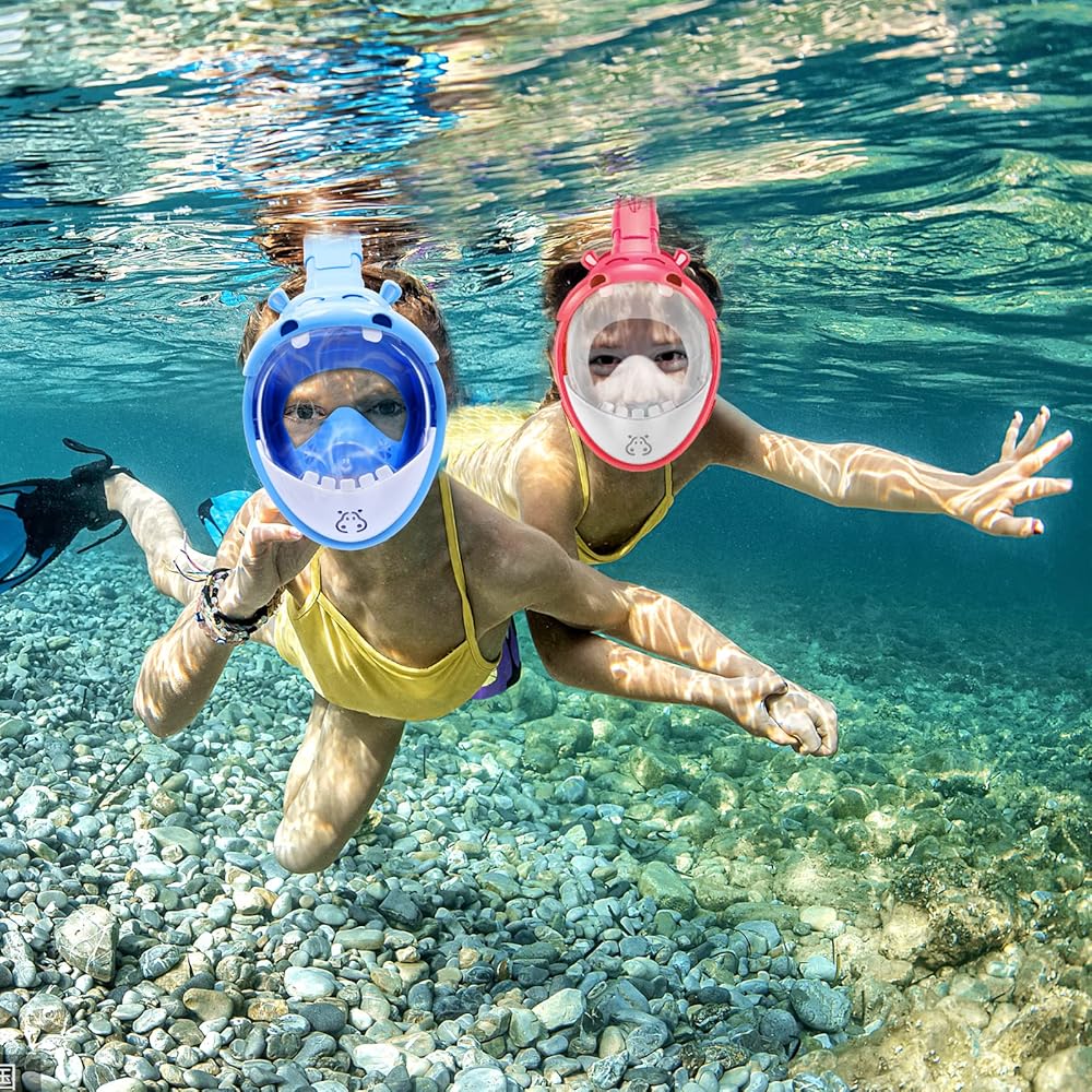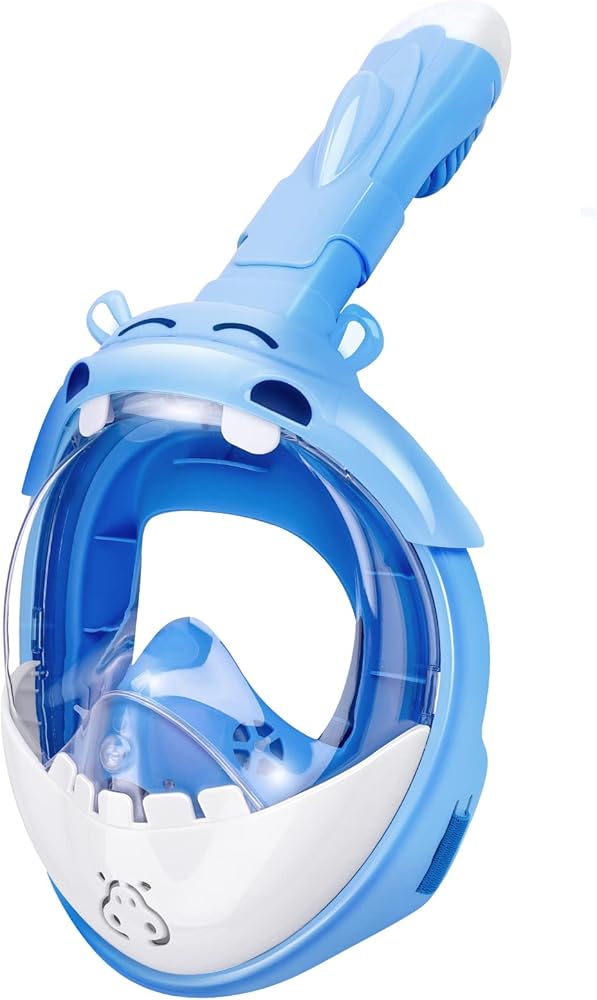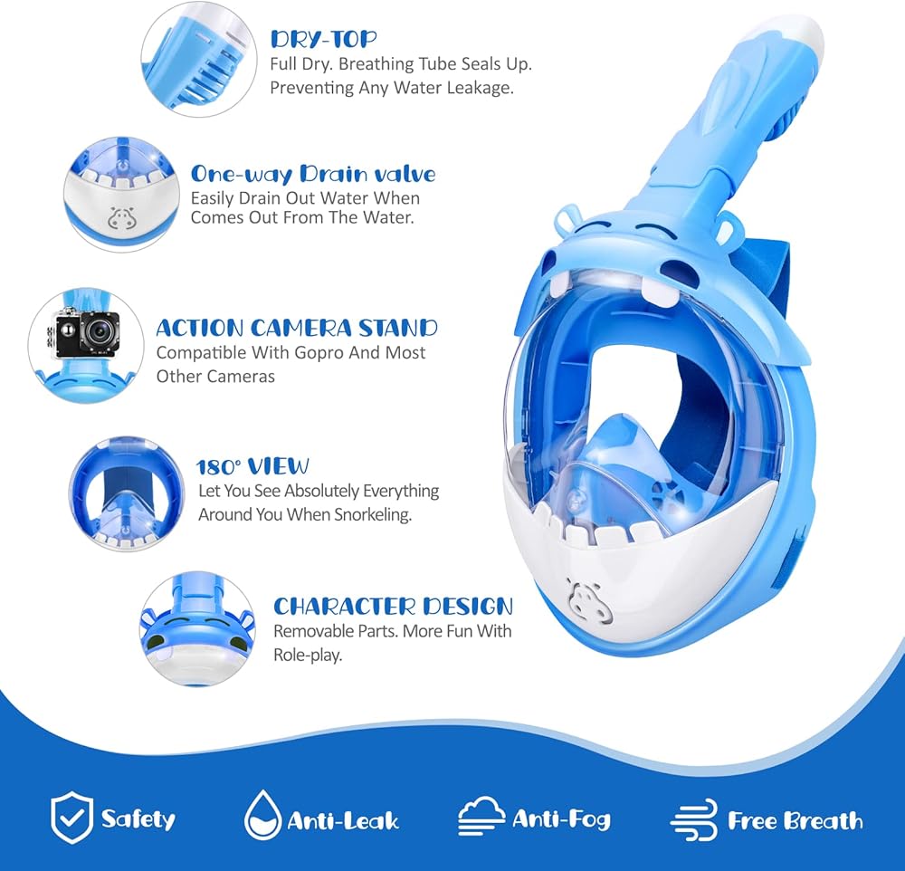 قناع الغطس لكامل الوجه للأطفال من جيميت، مجموعة غطس للأطفال رؤية بانورامية 180 درجة مع حامل الكاميرا، جزء علوي جاف قابل للطي ومضاد للتسرب ومضاد للضباب للغطس للأولاد والبنات