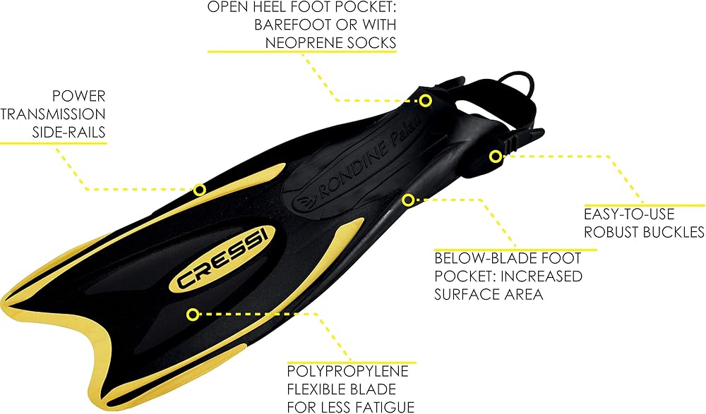 • تعتبر زعانف Palau مثالية للغطس الترفيهي ويمكن أن تناسب مجموعة واسعة من أحجام القدم بسبب الكعب المفتوح القابل للتعديل.