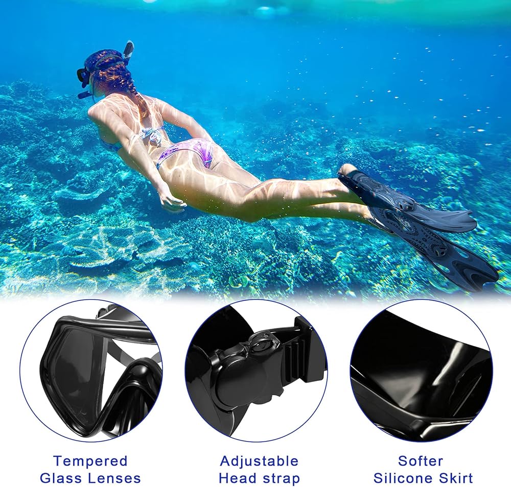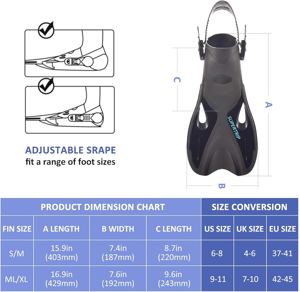 مجموعة كاملة من الغطس للبالغين: مجموعة غطس آمنة وقابلة للتعديل مع زعانف الغطس، مجموعة الغطس مع زعانف الغطس هي كل ما تحتاجه لتجربة الغطس المطلقة. بشكل عام، مجموعة زعانف الغطس مقاس S/M تناسب المقاسات من 6 إلى 8؛ مقاس L/XL يناسب المقاس من 9 إلى 11. يمكن تعديل زعانف الغطس ذات الكعب المفتوح القابل للتعديل لتناسب معظم الأشخاص حيث يمكنك مشاركتها مع أصدقائك أو عائلتك.