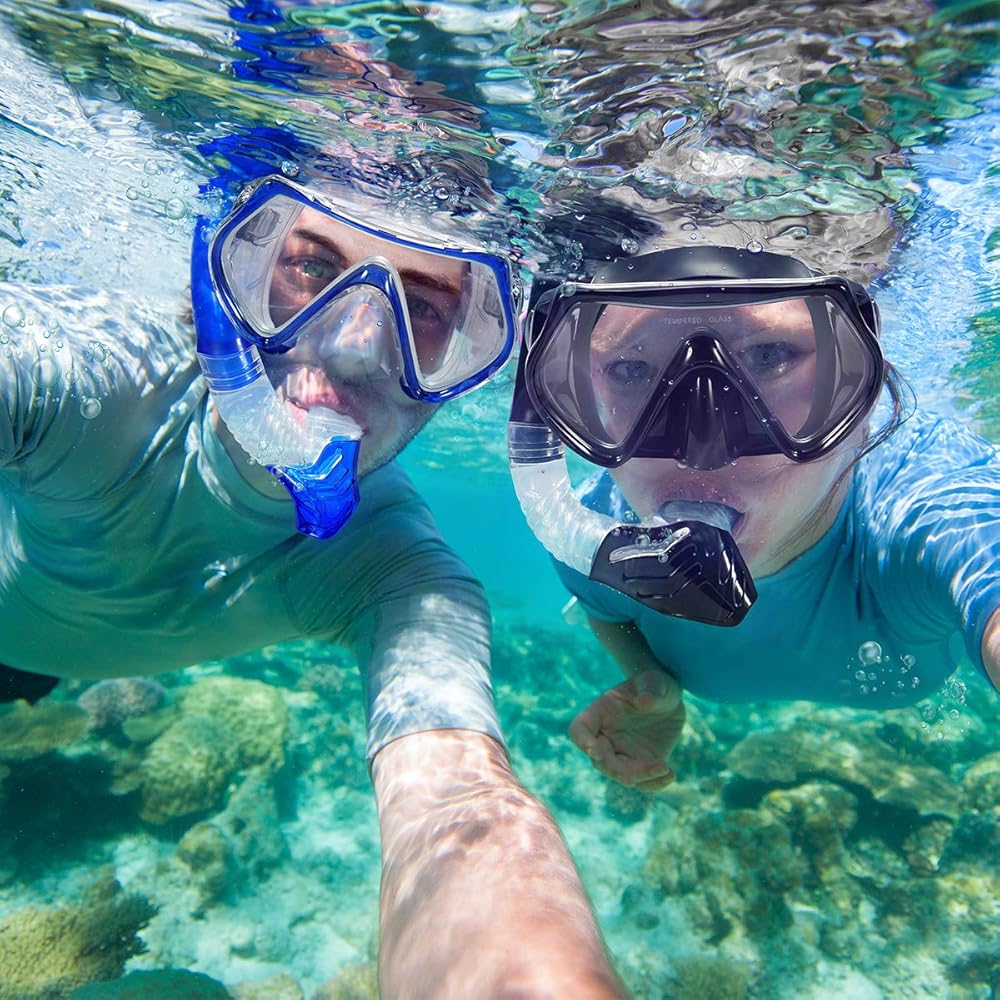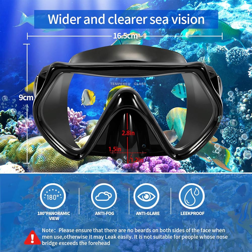زجاج مقسى مع طبقة مضادة للضباب: قناع الغطس نظارات الغطس مصنوعة من زجاج مقسى مقاوم للصدمات مع طبقة مضادة للضباب، والتي يمكنها امتصاص بخار الماء بالكامل لمنع توليد الضباب في العدسات، حتى تتمكن من التقاط بحر أكثر جمالاً. عرض تحت الماء دون تعفير أثناء السباحة والغطس.