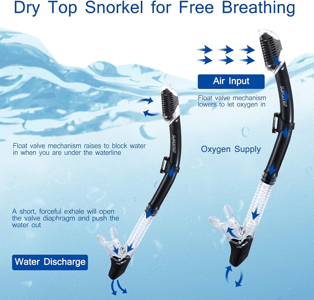 مريحة: مجموعة الغطس والقناع من Supertrip مصنوعة من السيليكون الآمن غذائيًا وتأتي مع راحة كبيرة. تسمح قطعة الفم المصنوعة من السيليكون الملائمة للطعام بالاستخدام لفترات طويلة دون أي إزعاج. مجموعة الغطس مناسبة للبالغين والشباب والرجال والنساء.