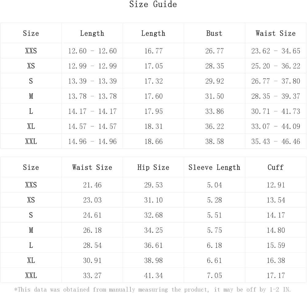 XS: الصدر: 28.3 بوصة، أساور الأكمام: 13.5 بوصة، الطول: 17.0 بوصة، طول الكم: 5.3 بوصة، مقاس الخصر: 23.0 بوصة