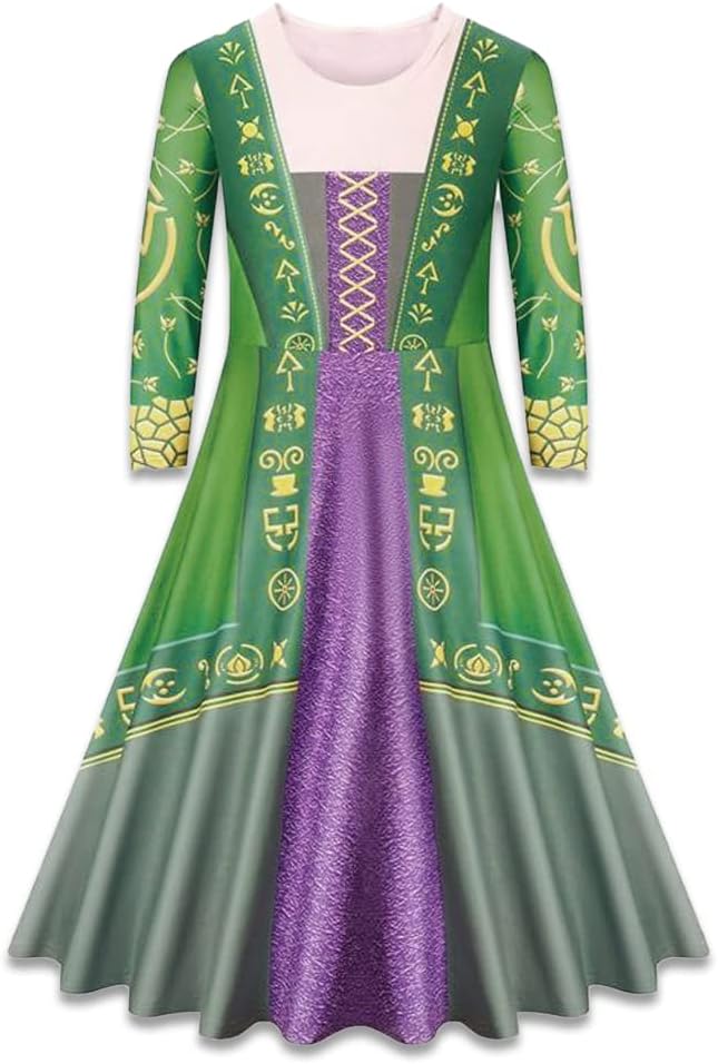 فستان Sanderson التنكري: فستان مريح بأكمام طويلة مع طباعة Sanderson Sisters بالكامل. لإكمال مظهر Hocus Pocus، يمكنك أيضًا إضافة ملحقات أخرى مثل الشعر المستعار والعباءة.