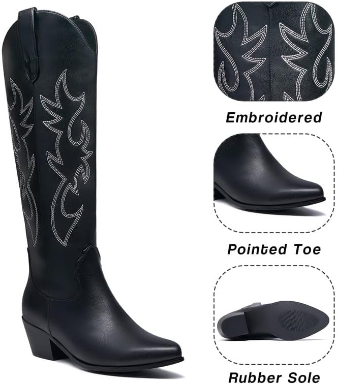 👢تصميم مطرز كلاسيكي: تم تصميم أحذية راعية البقر السوداء هذه بتطريز كلاسيكي على العمود الجلدي، نمط سحب لسهولة الارتداء والخلع، مقدمة مدببة على شكل لوز تظهر طراز غربي أنيق وأنيق، كعب متوسط سميك 2.5 سم لسهولة المشي، نعل مطاطي وبطانة ليكرا.