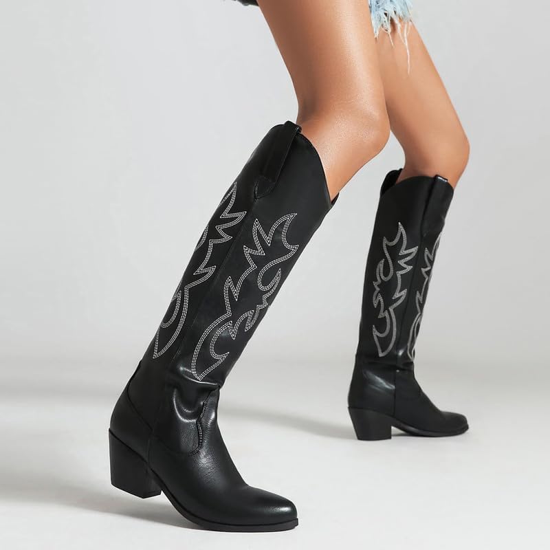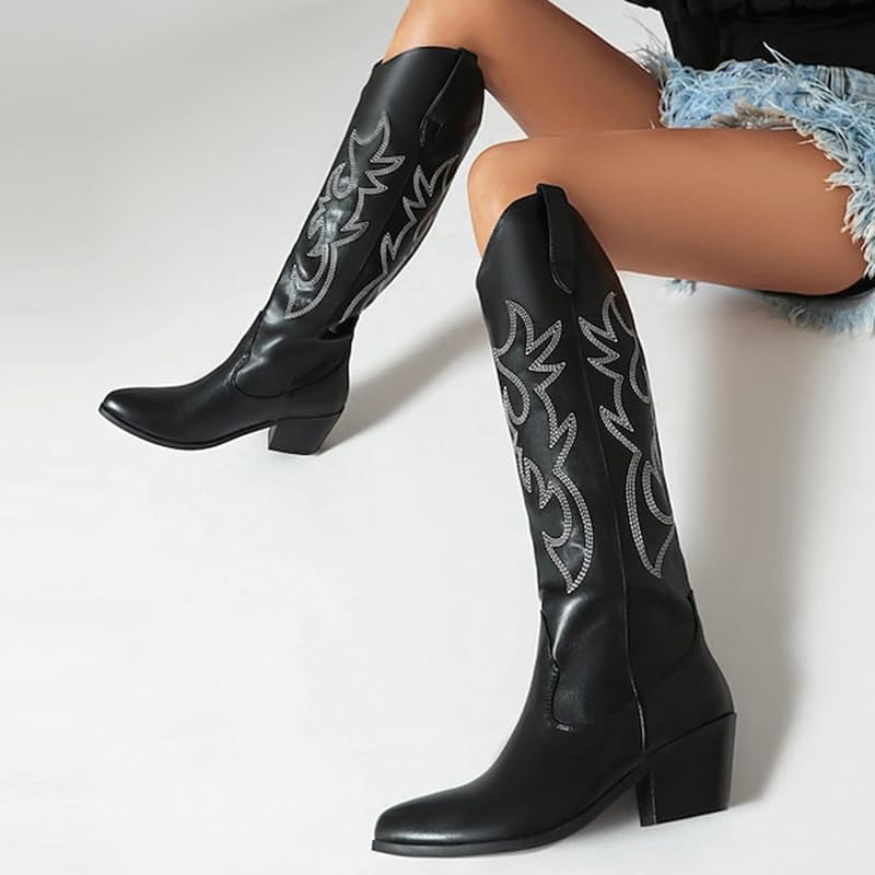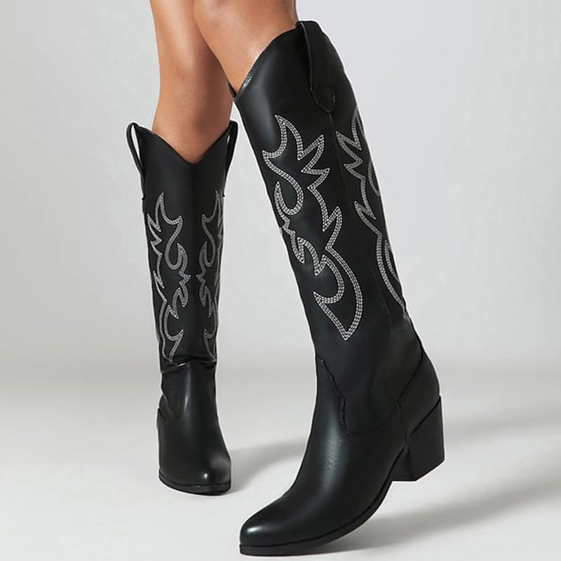 أحذية GOSERCE النسائية لرعاة البقر الغربي مع كعب مكتنز مطرز وكعب عريض 2.5 بوصة، أحذية راعية البقر الكلاسيكية متوسطة الساق، على شكل لوز، مقدمة مدببة، أحذية عالية للركبة، تصميم عصري