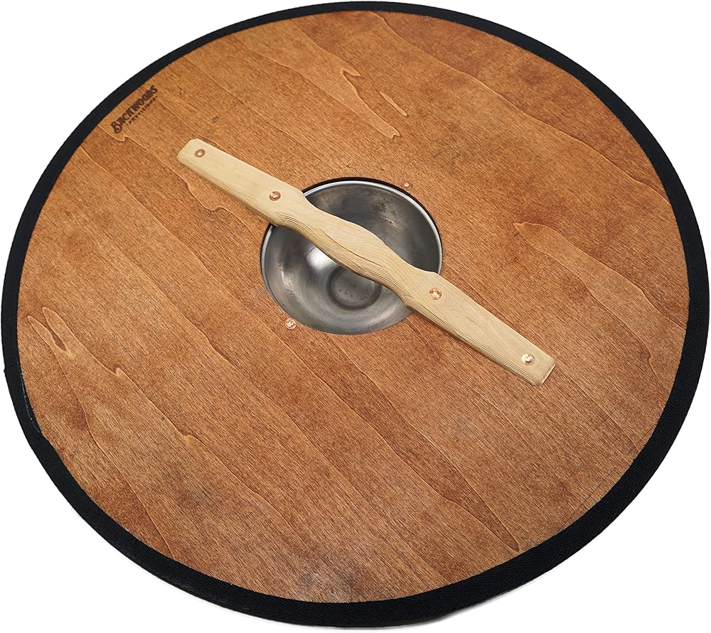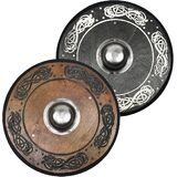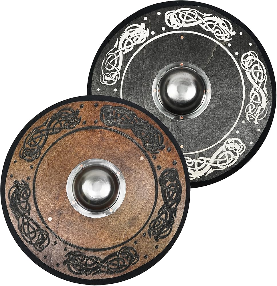 درع الفايكنج خفيف الوزن ولكنه متين بحجم الأطفال مع تصميم منقوش نورسي في بقع مختلفة مصنوع من 3 طبقات من الصنوبر، ويتميز برأس/أومبو فولاذي يغطي يد المستخدم، بالإضافة إلى مقبض خشبي. تم بناؤه بمسامير نحاسية بطريقة مشابهة جدًا للاكتشافات الأثرية الحقيقية. الحافة ملفوفة بقماش أسود. إنه يعمل بشكل جيد كإبزيم أو تارج للاتصال الخفيف، وهو مثالي للهالوين، ورين فير، والحفلات التنكرية، وSCA.