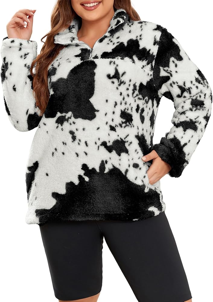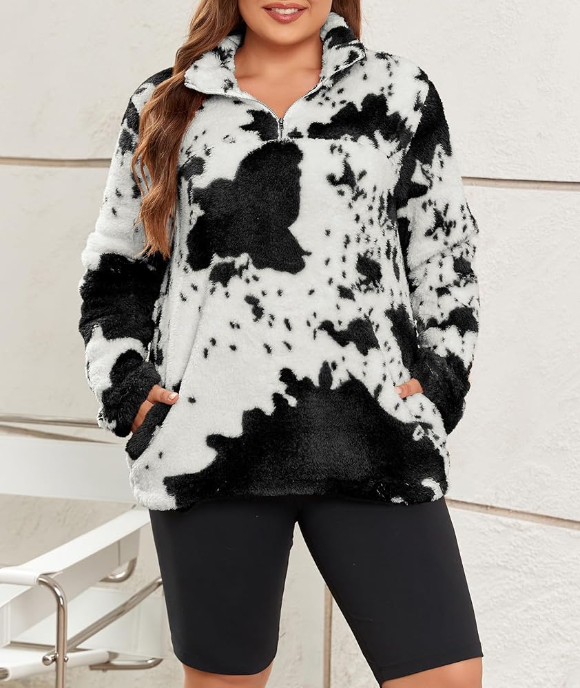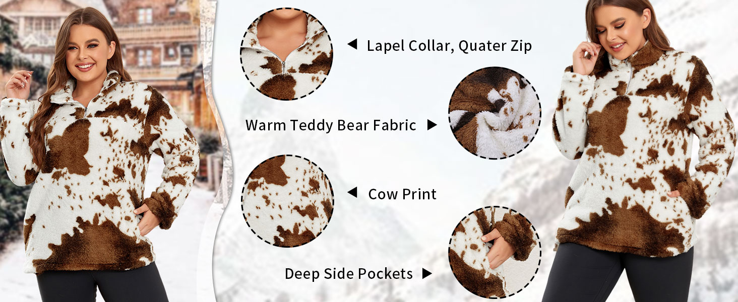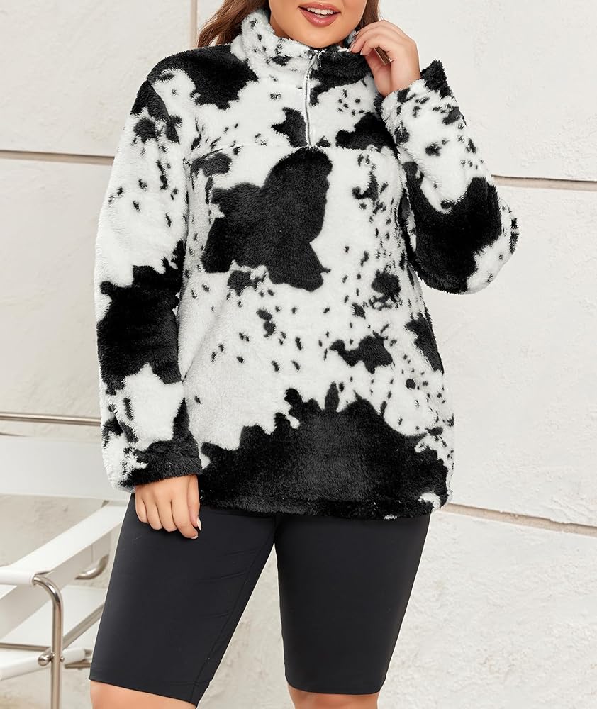 تصميم فريد من نوعه - يتميز المعطف الخارجي ذو الأكمام الطويلة والمقاس الكبير بطباعة بقرة عصرية لعام 2023، وسويت شيرت من النوع الثقيل، وياقة طية صدر السترة، وسحاب 1/4 يمكن سحابه لأعلى أو لأسفل لارتداء متعدد الاستخدامات وتحديث مظهرك اليومي. كم طويل، طراز كاجوال، جيبان جانبيان عميقان يساعدان على حمل هاتفك أو مفاتيحك بشكل مريح. سوف تكون النجم المتلألئ بين الحشود مع سويت شيرت من صوف الشيربا بطبعات البقرة.
