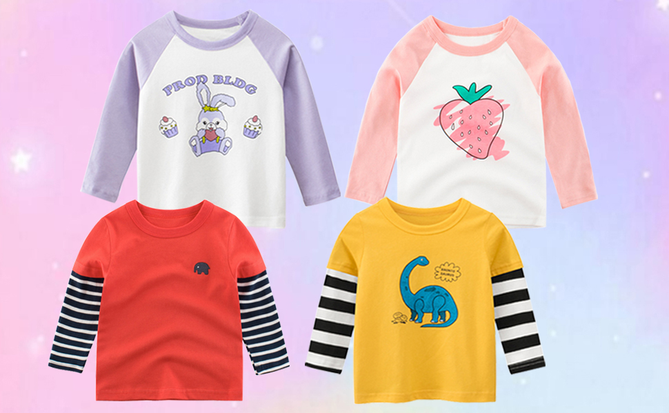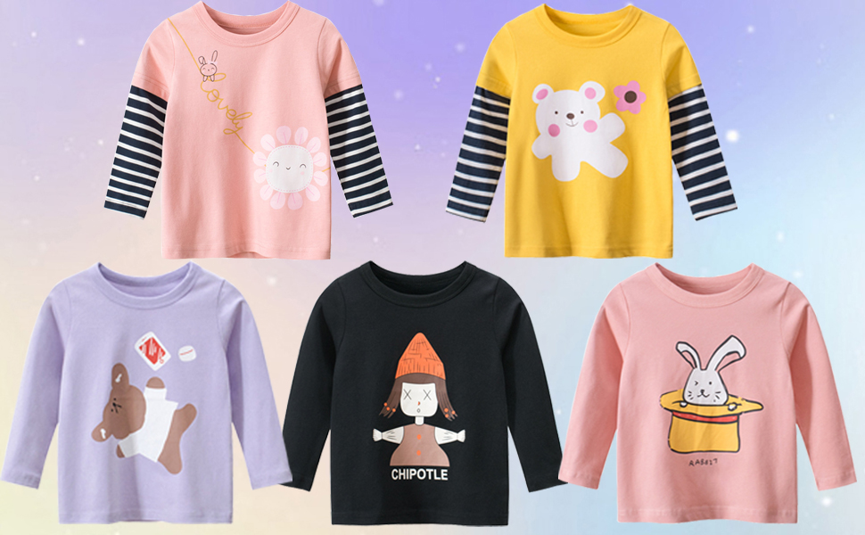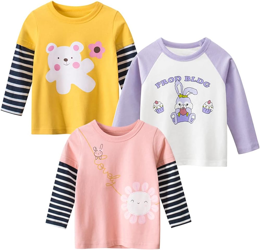 • عبوة من 3 تي شيرتات بأكمام طويلة للفتيات الصغيرات، ستضيف التصميمات اللطيفة لمسة من التصميم النابض بالحياة للخريف والشتاء
